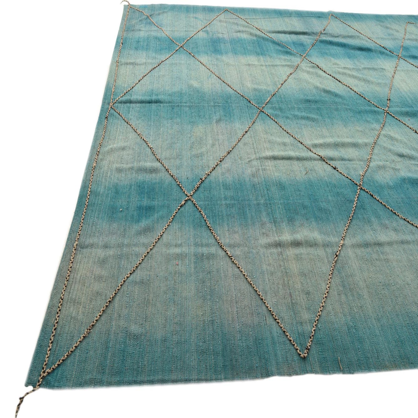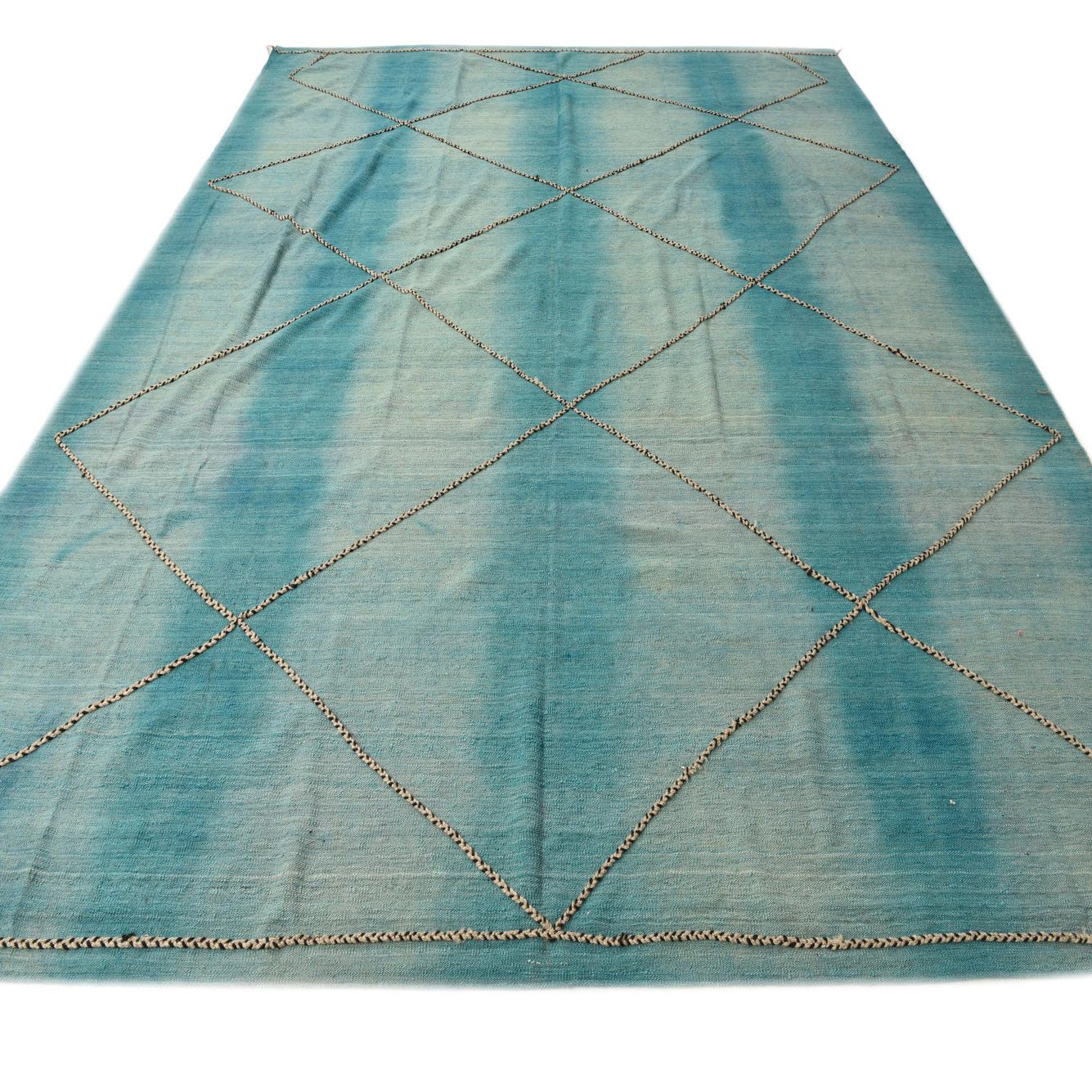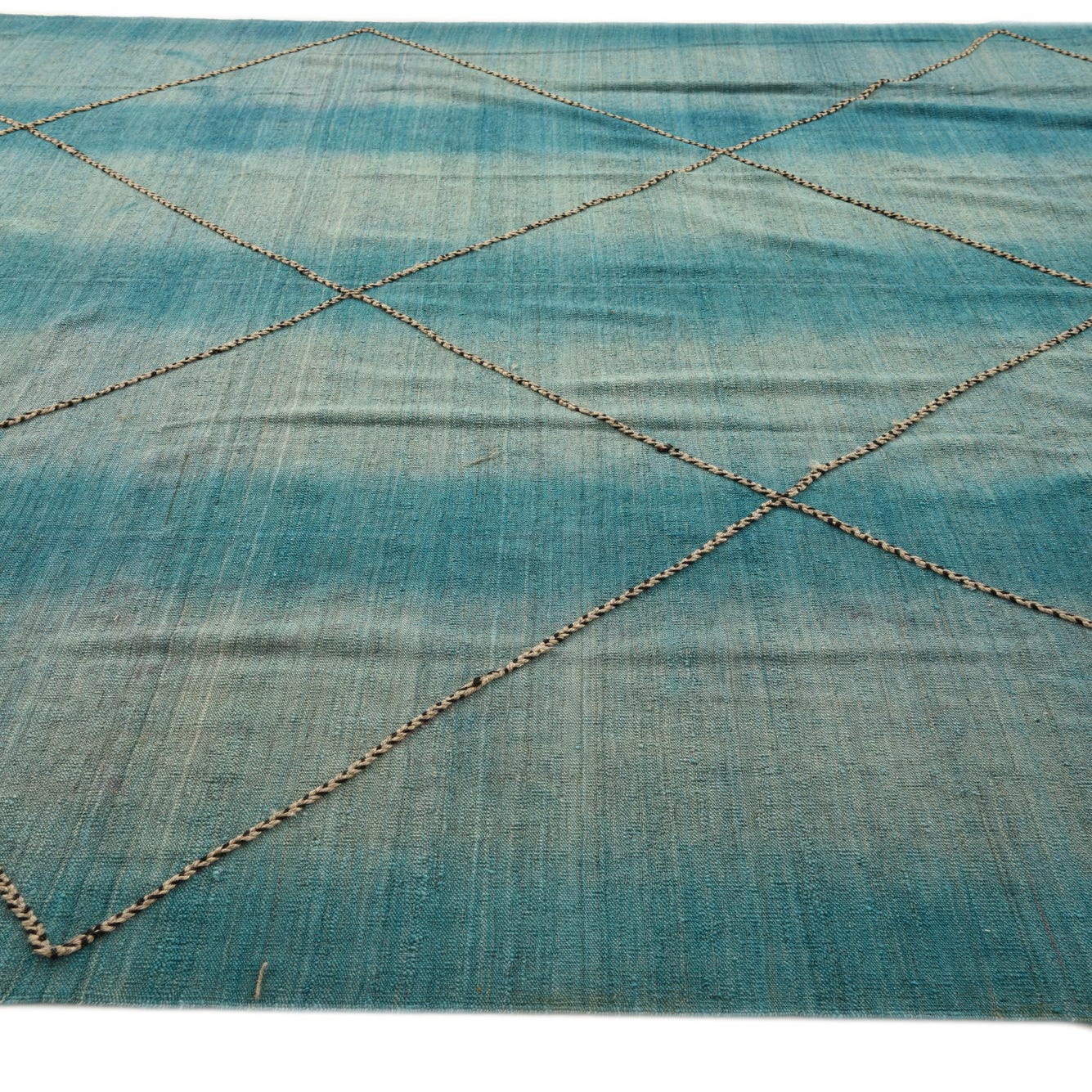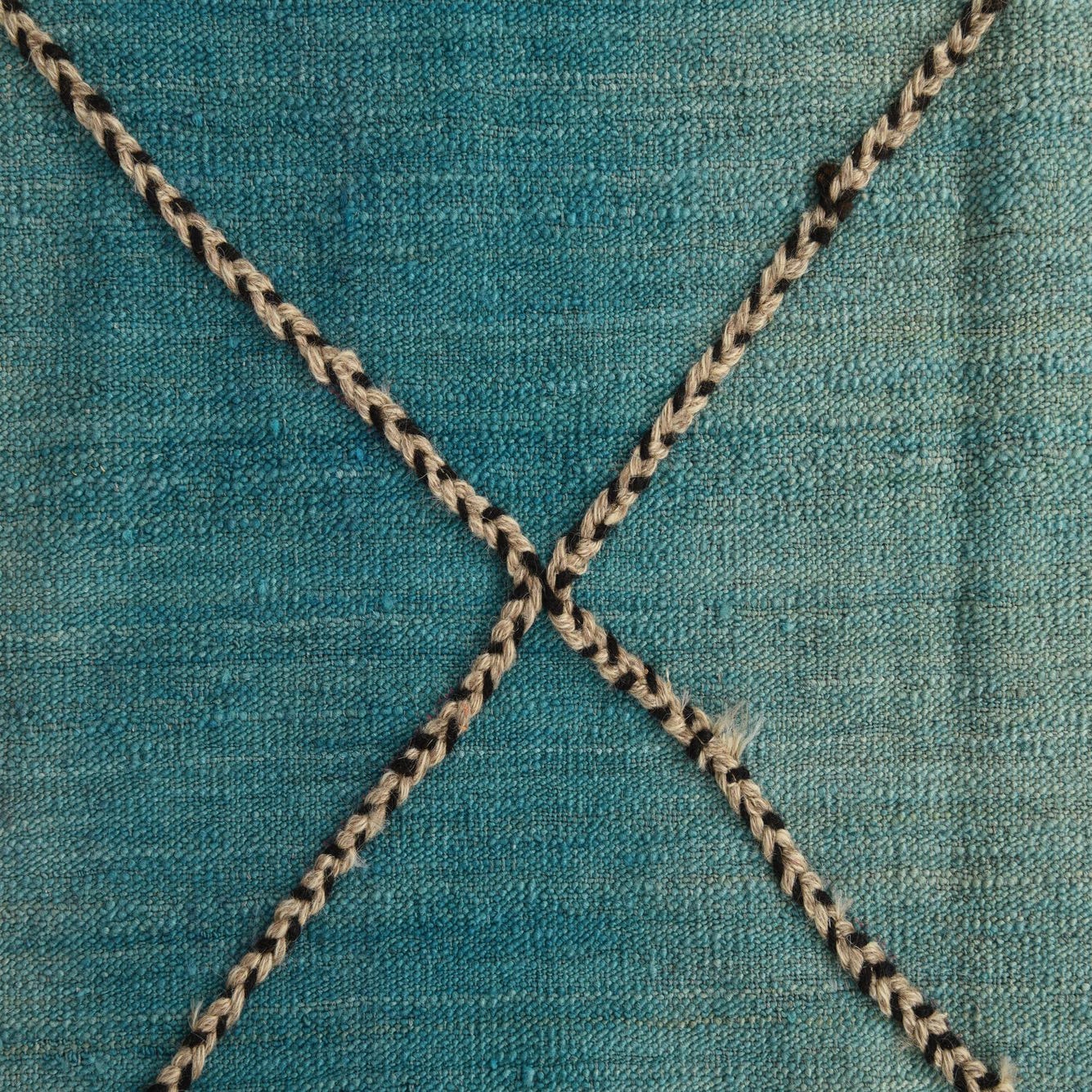 Primary color is Turquoise. Colors in this rug include: Turquoise, Black, Ivory.