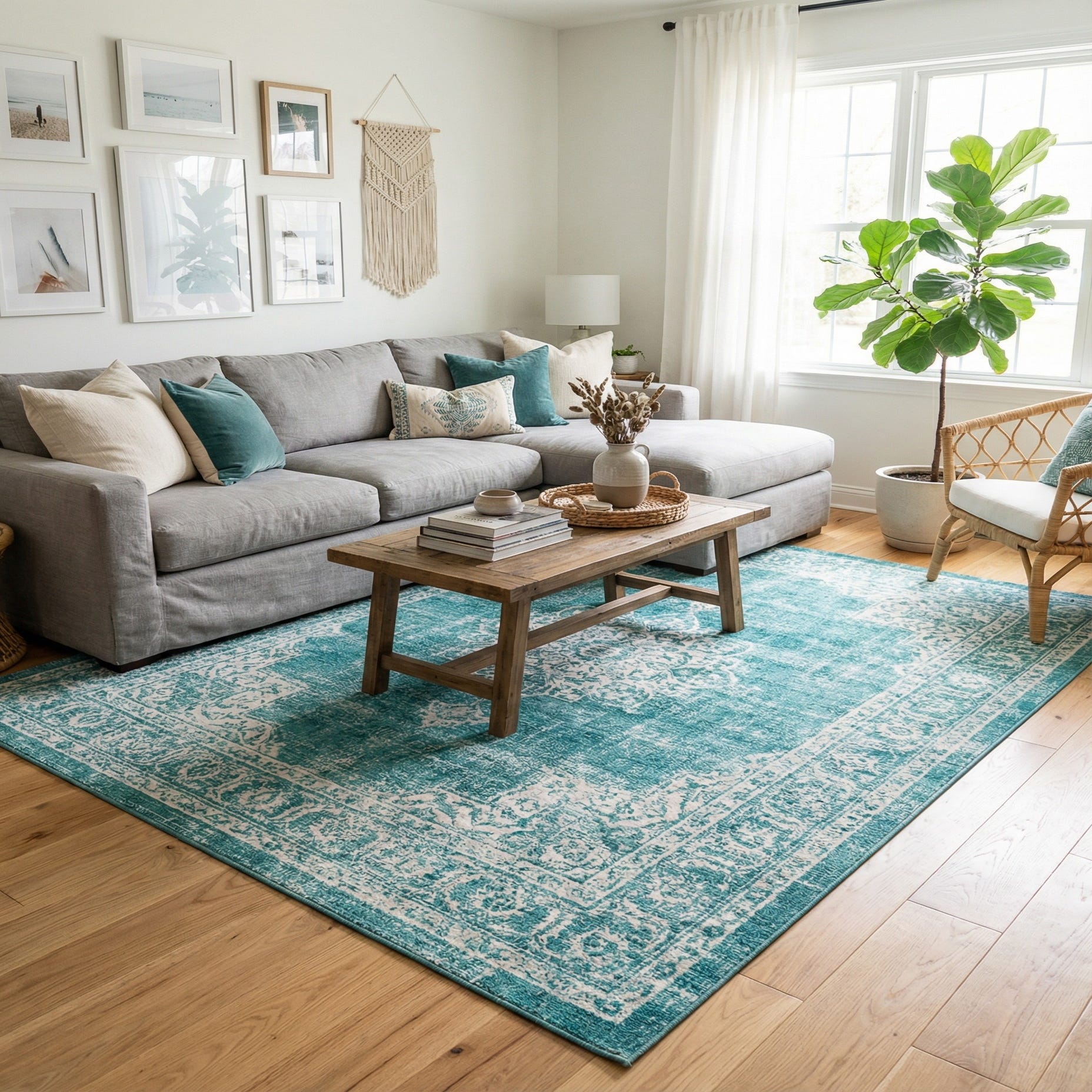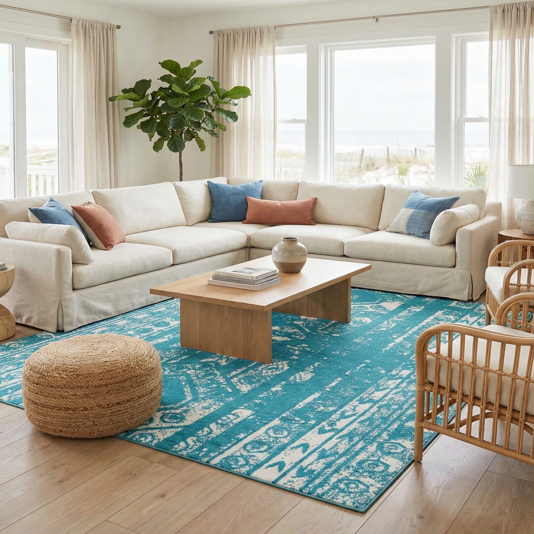 This colorway and pattern work especially well in coastal or beach-style rooms when paired with white linens and natural wood, or in a modern bohemian living space alongside rattan furniture and plenty of greenery. It also fits nicely beneath a coffee table to anchor a neutral seating area, or in a bedroom to introduce a bold wash of color without overpowering other accents. The polypropylene construction keeps the rug practical for everyday spaces that need lively pattern and easy-care performance.