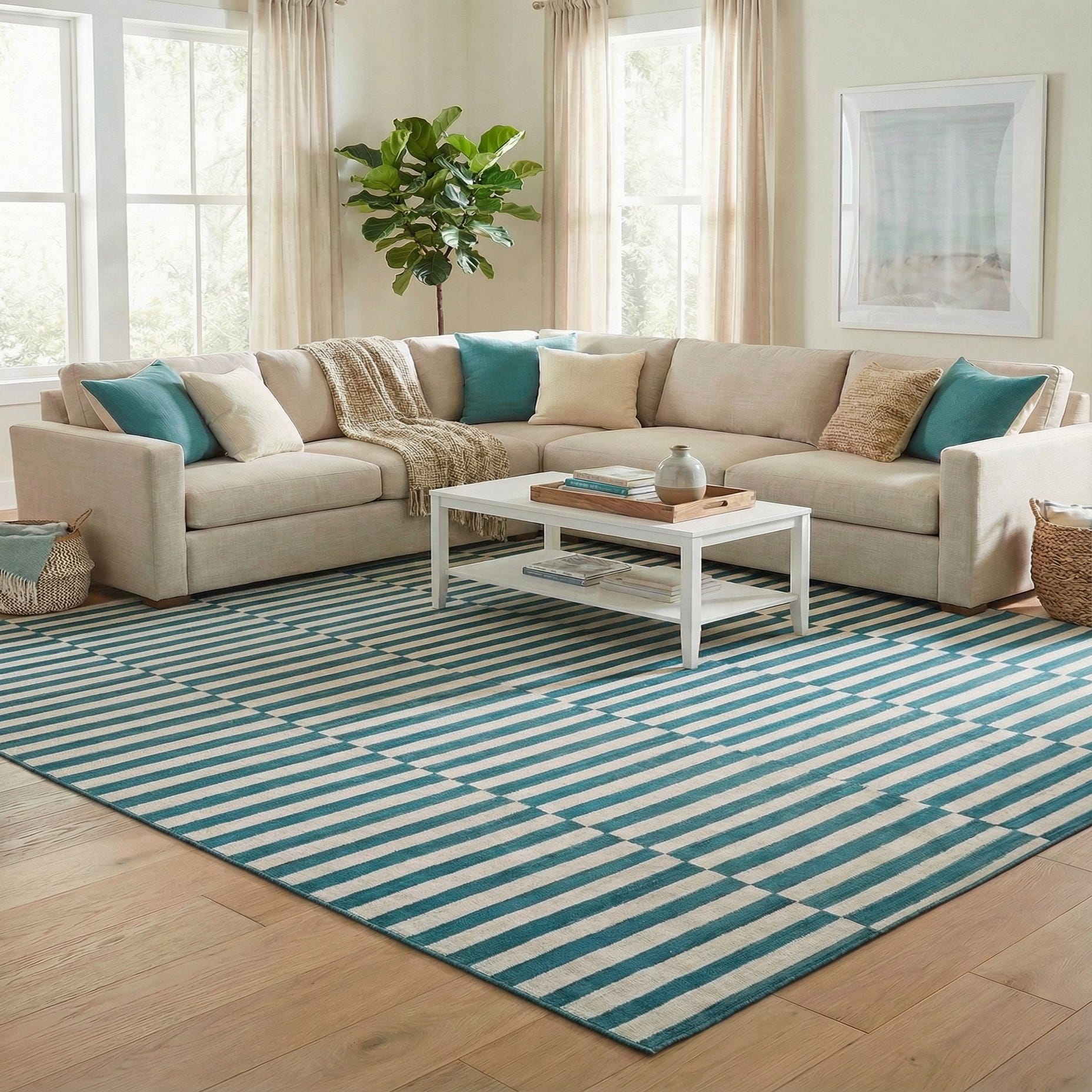 We bought 2 of these - one fr our living room and one for the kitchen - since the rooms are open and have the same color scheme. Pay attention to the pile height - it is pretty flat and not as plush as the other low pile rugs we ordered. And because of that it is taking a while to lay completely flat. The larger size flattened out quicker than the smaller size and we can still see some ripples and the corners still stick up. Color is gorgeous though (we got the teal) and size is accurate.