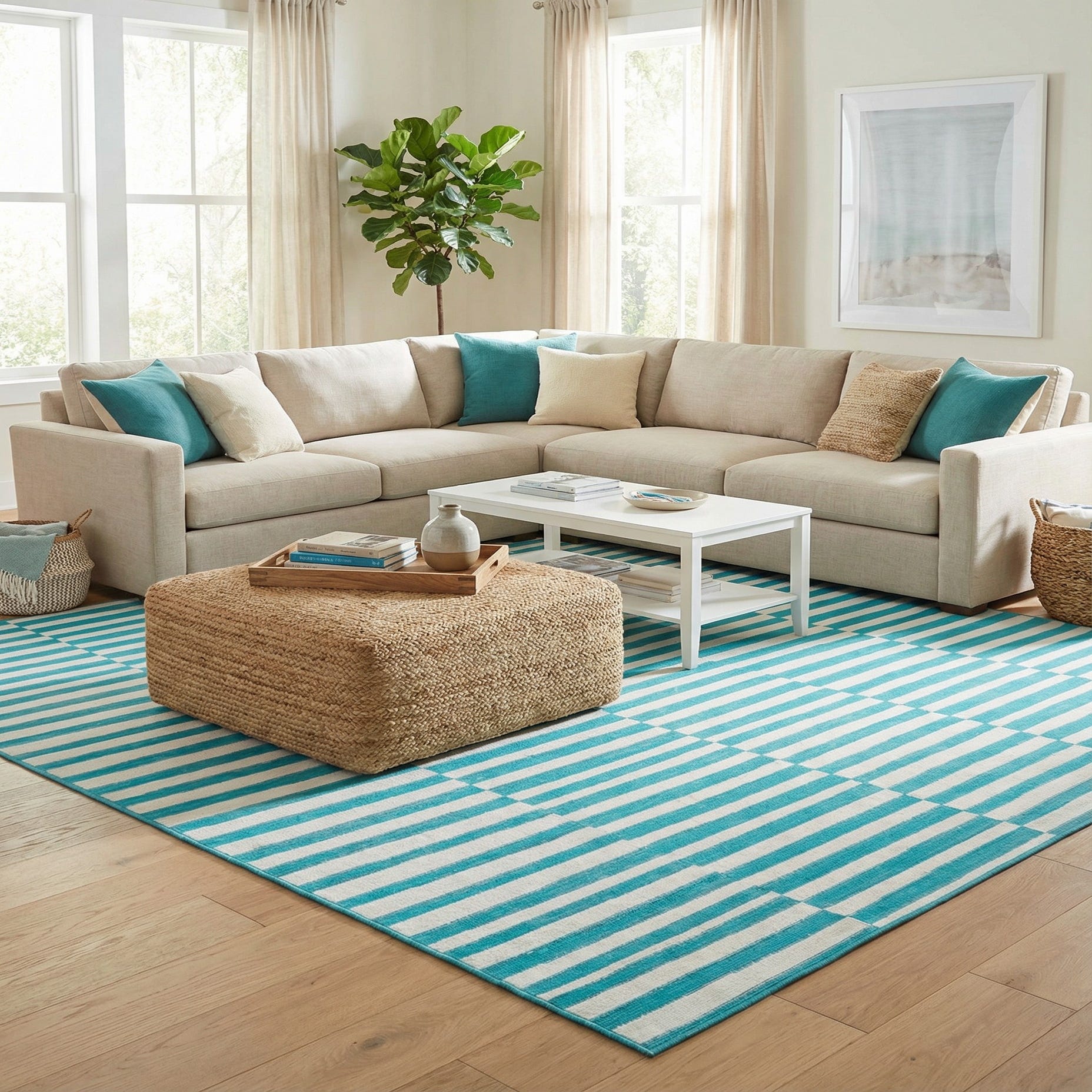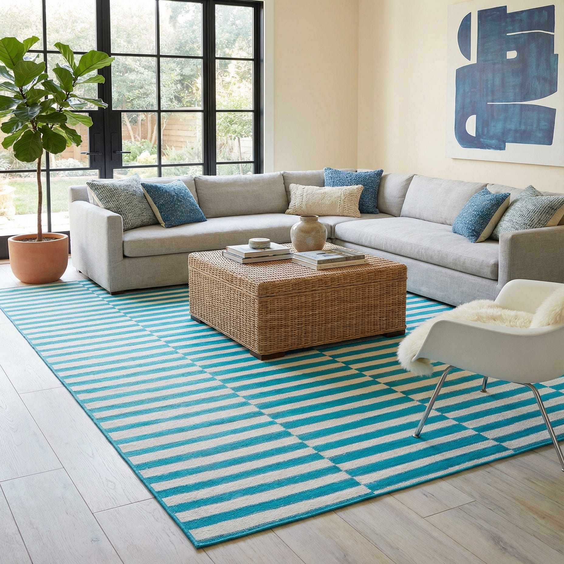 Primary color is Turquoise. Colors in this rug include: Turquoise, Ivory.