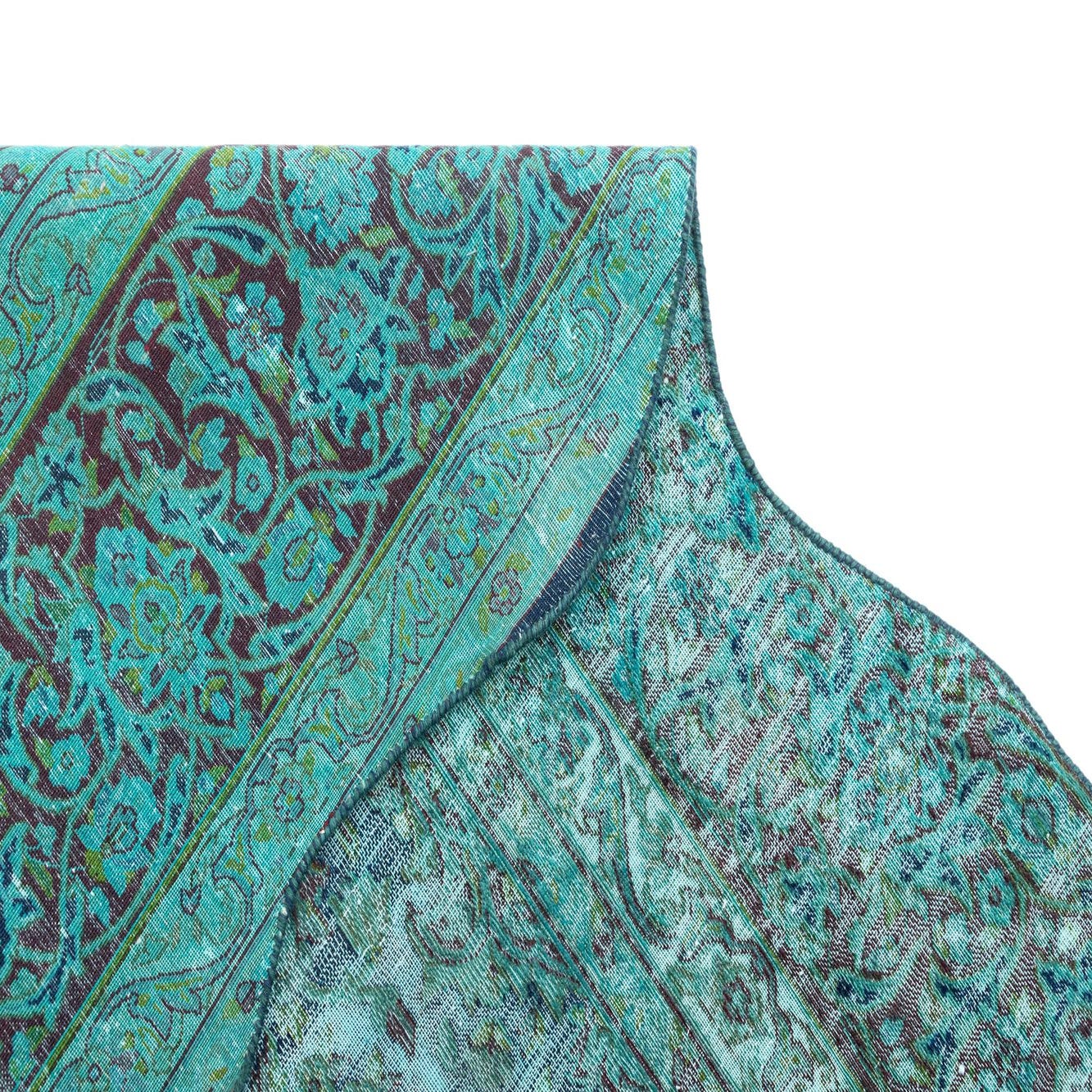 This hand-made 10x13 piece from the Vintage Royal collection conveys a sense of timeless elegance with its overdyed palette. The rug features a complex array of patterns, infused with various shades of turquoise as the dominating background color, complemented by thoughtful touches of blue, red, and dark blue. The texture of the 100% wool construction offers a plush feeling underfoot, suggesting both comfort and durability.