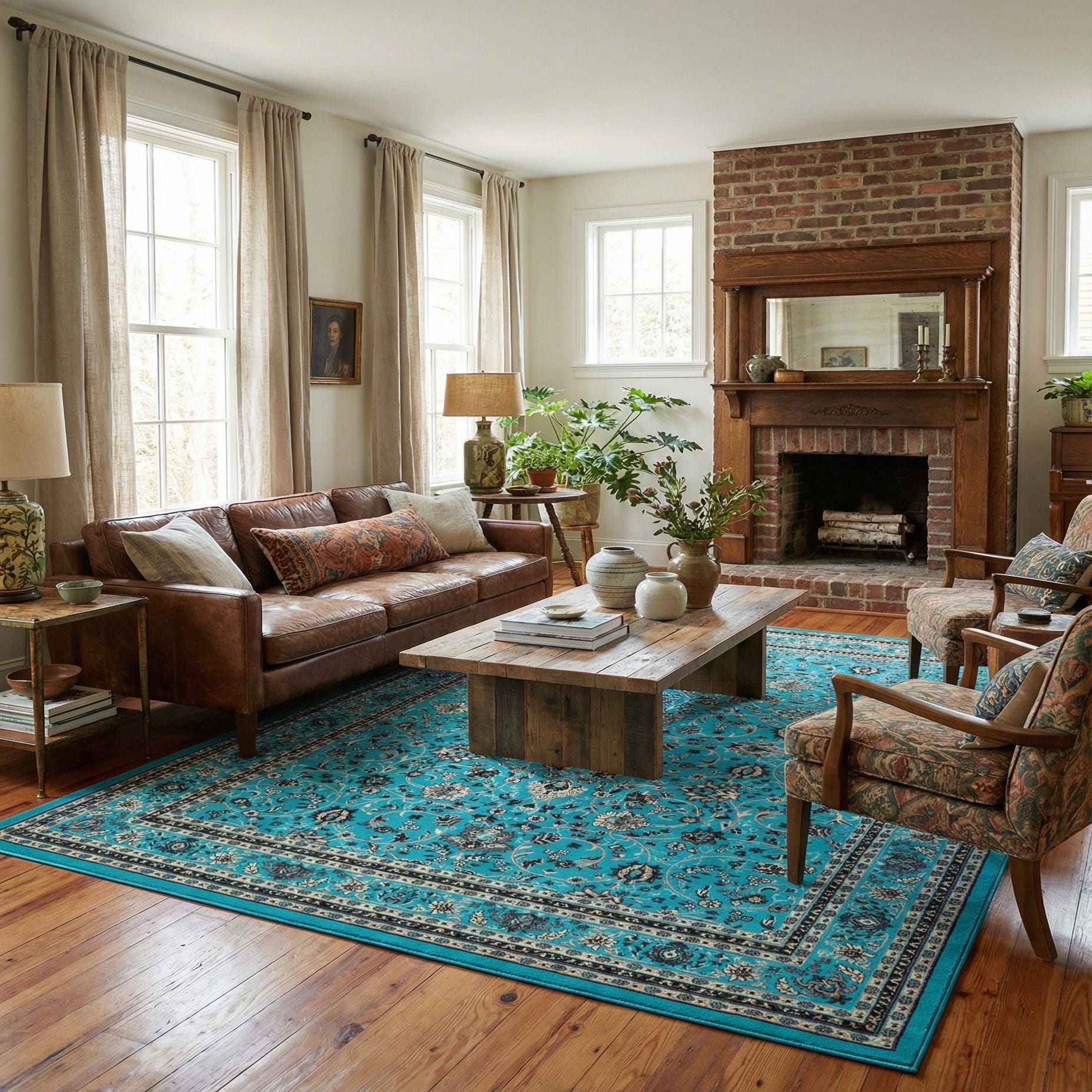 This rug pairs naturally with light-wood or white-painted furnishings for a coastal or Mediterranean look, and also brings lively color to a neutral, contemporary living room when placed beneath a seating group. It suits a formal dining area as an anchor beneath the table, or a bedroom where turquoise accents and gray or cream textiles create a calm, coordinated palette.