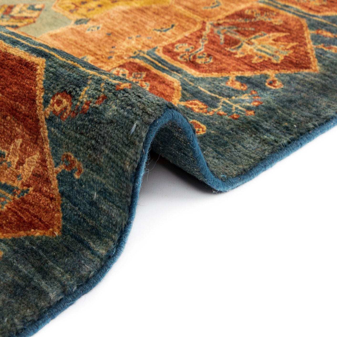 The Luribaft collection presents a hand-made 11 Ft Runner rug crafted from 100% wool, showcasing a rich interplay of colors and textures. This runner features a striking pattern of geometric and botanical motifs, with a harmonious color palette that combines turquoise, brown, and orange hues on a turquoise background.