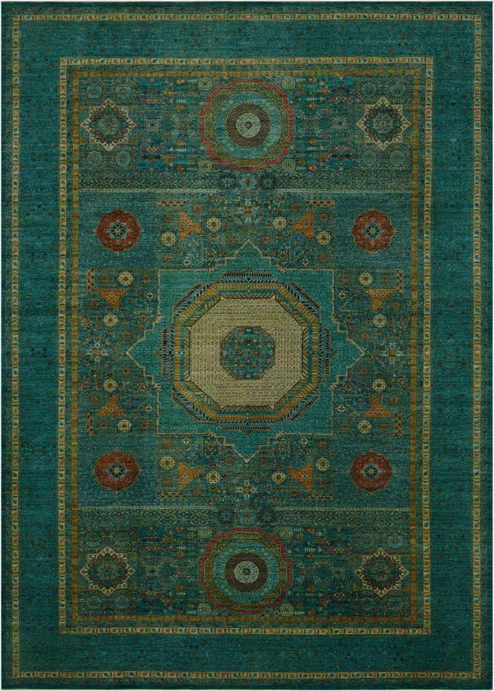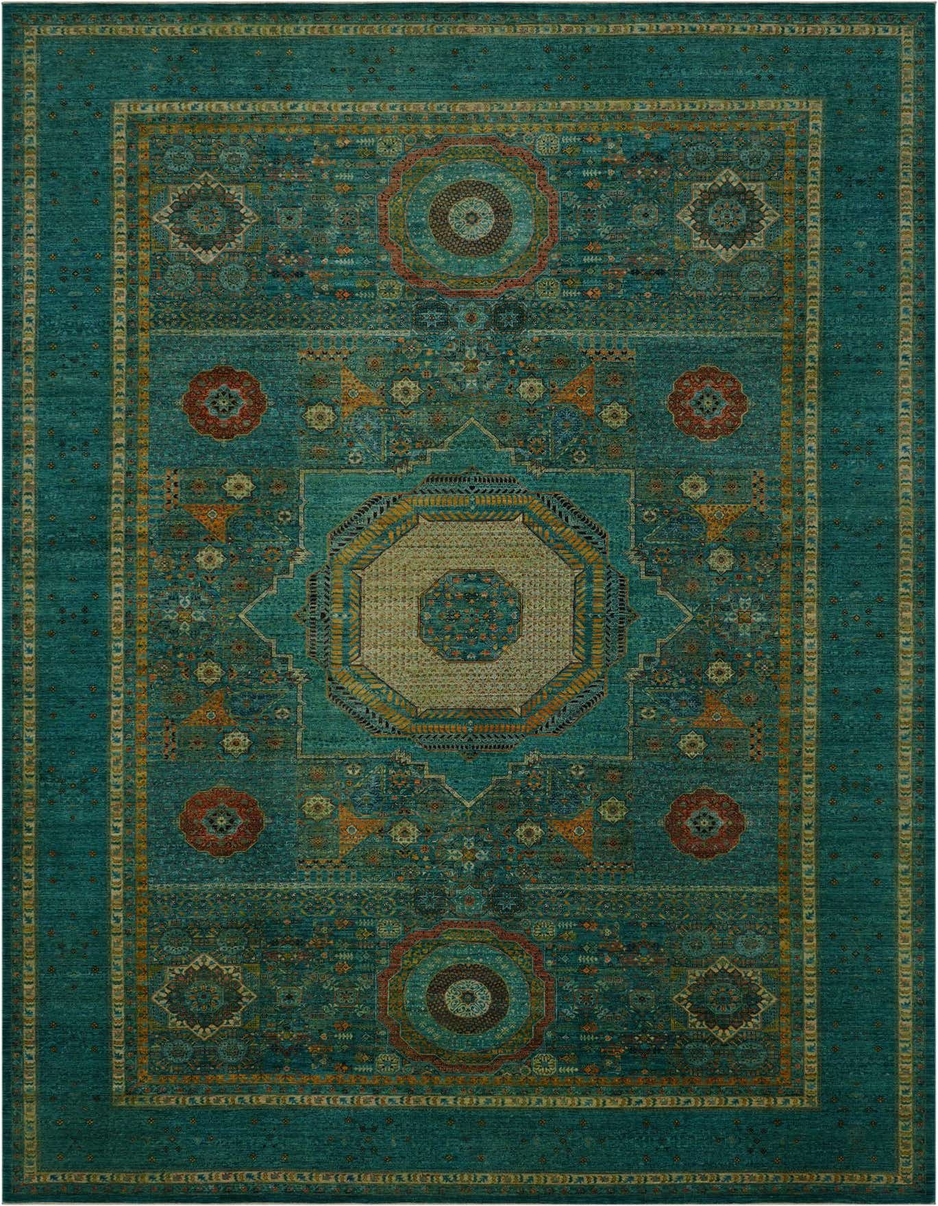 Primary color is Turquoise. Colors in this rug include: Turquoise, Beige, Blue, Brown, Green, Olive, Orange, Light Green, Red.