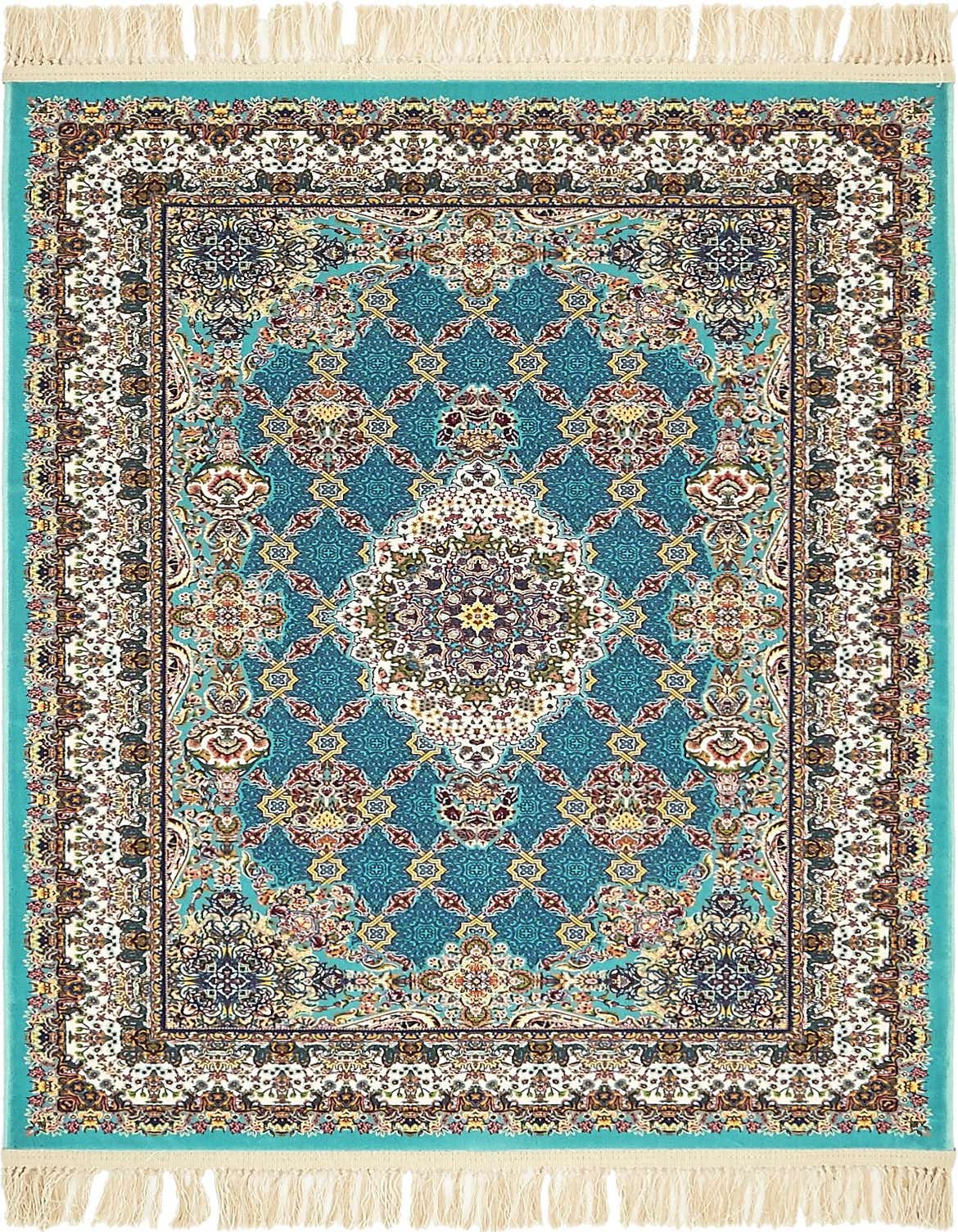 Primary color is Turquoise. Colors in this rug include: Turquoise, Gold, Green, Ivory, Navy Blue, Orange, Puce, Red.