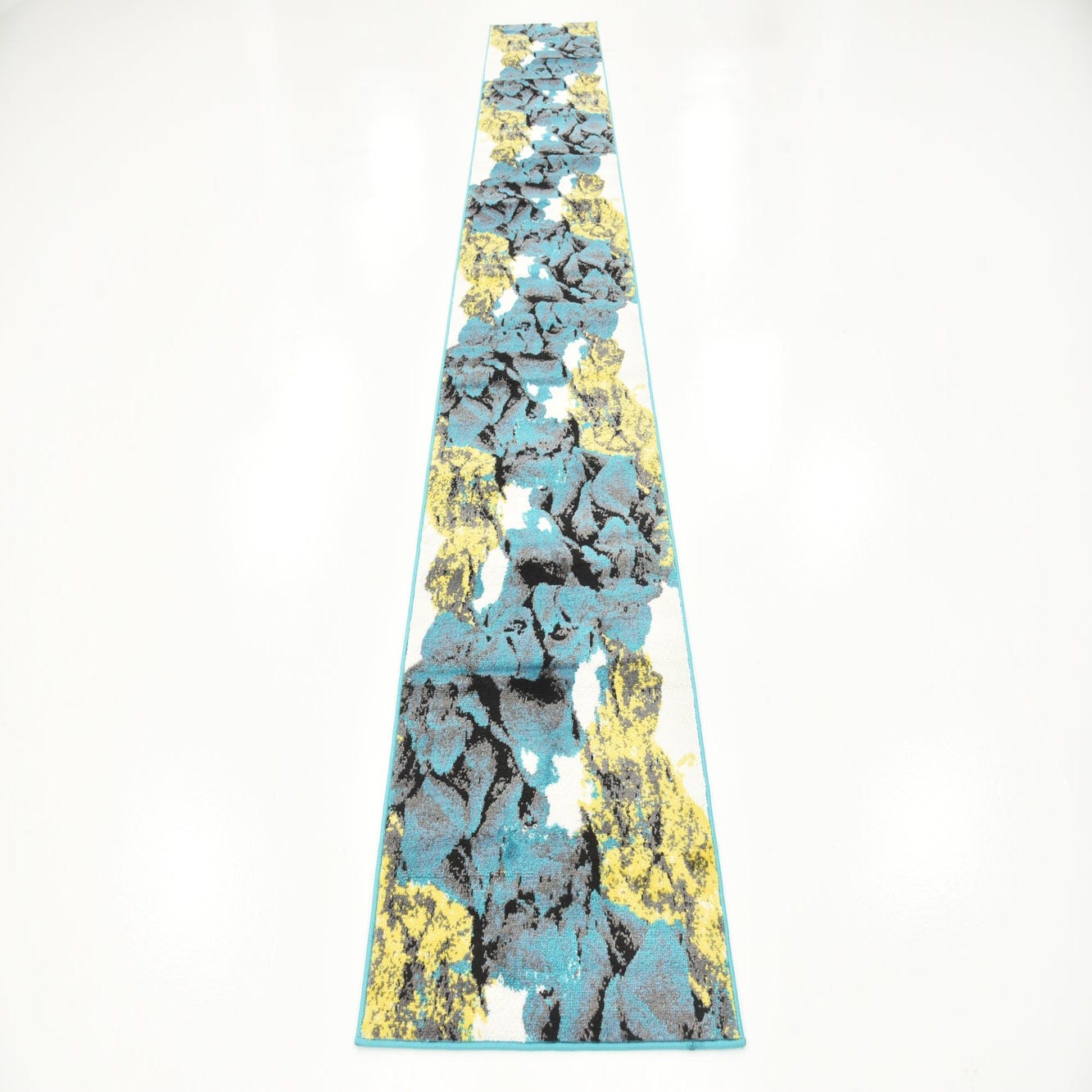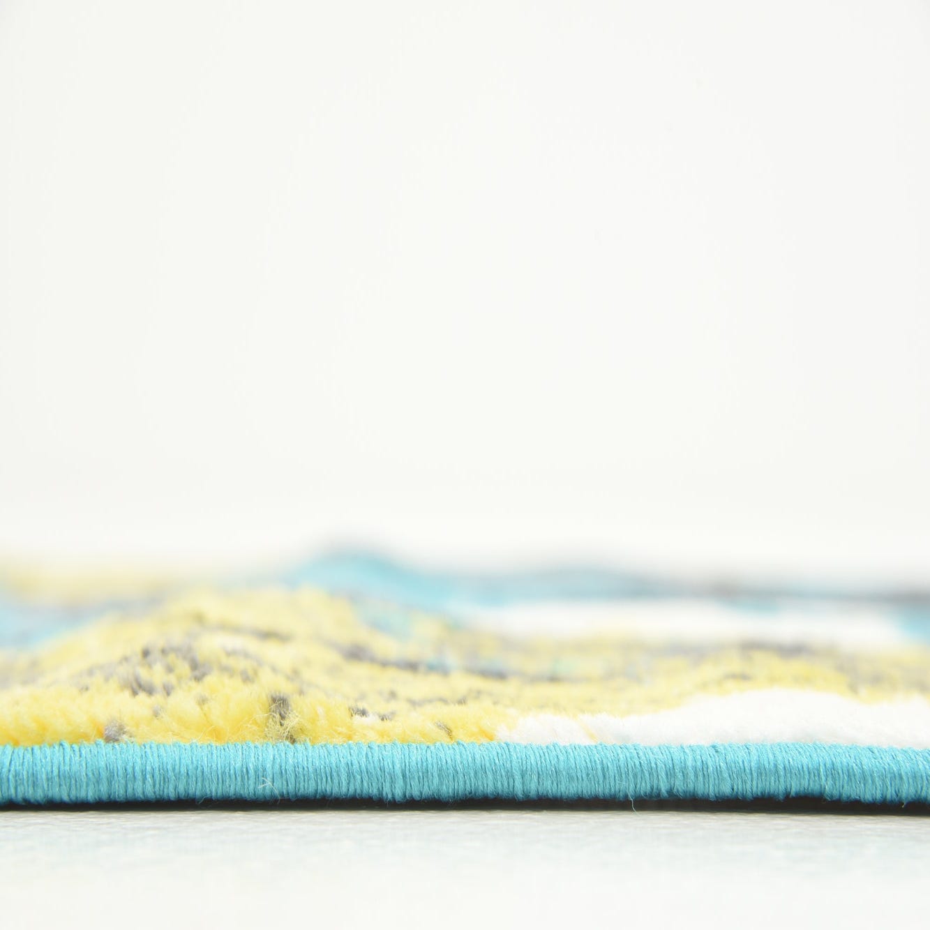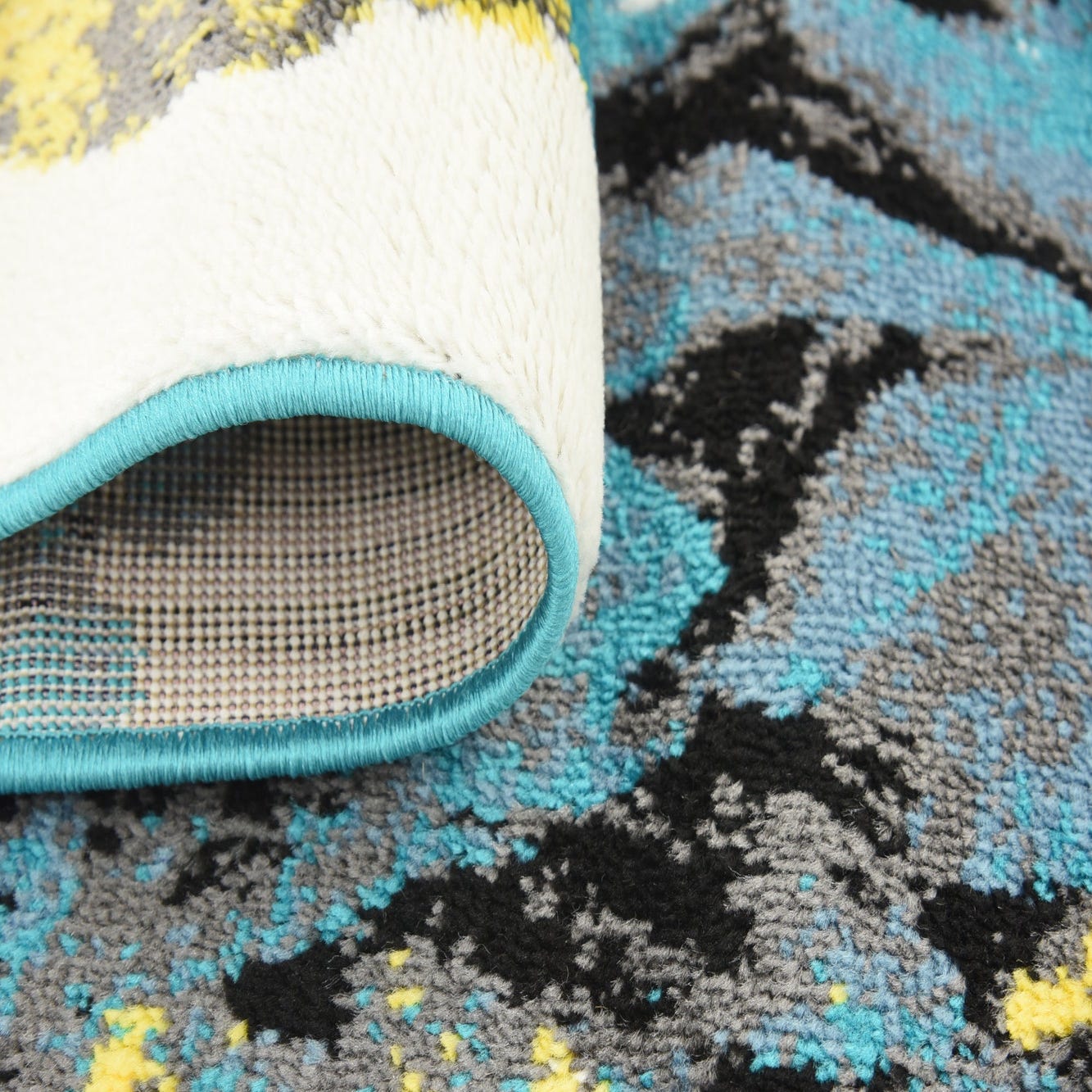 Primary color is Turquoise. Colors in this rug include: Turquoise, Black, Gray, Yellow, Ivory.