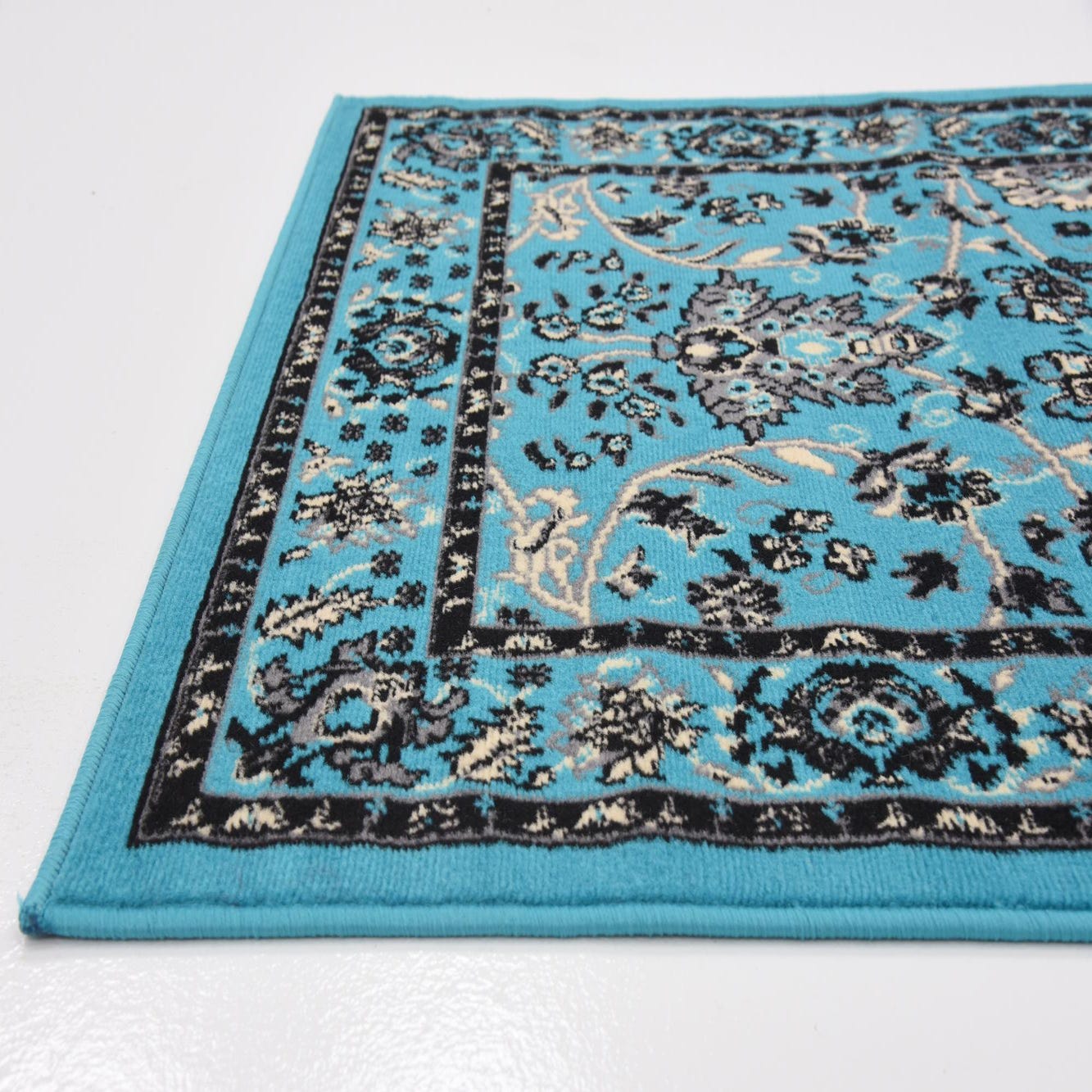 A classic floral medallion runner rendered on a bright turquoise ground, this rug pairs a traditional scrolling vine motif with a defined inner and outer border in black, cream, and gray. The pattern repeats with finely detailed blossoms and arabesque elements that read crisp against the saturated background, giving the runner a timeless, slightly formal character that still feels fresh. Machine made of 100% polypropylene, the surface has a low, smooth pile with a firm hand and a subtle sheen that highlights the contrast between the turquoise field and the darker motifs.
