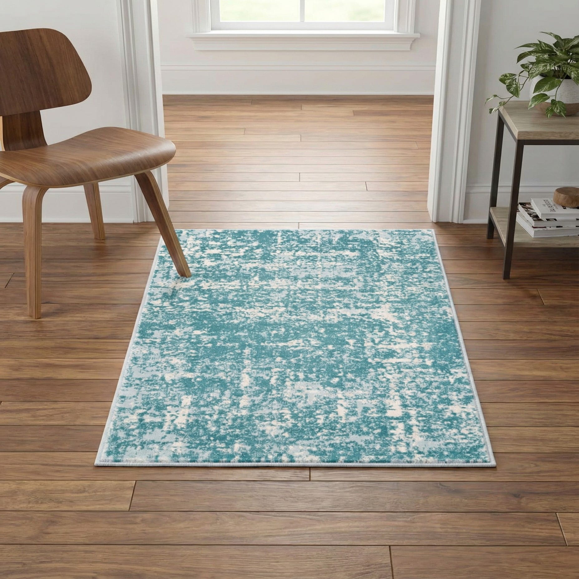 A mottled, abstract pattern in turquoise and ivory gives this machine-made rug a relaxed, weathered look. The turquoise background is patterned with irregular ivory patches that create depth and movement without a defined border or medallion, making the design modern with a subtle vintage influence. The overall effect is casual and versatile, bringing a splash of color that remains soft and approachable.