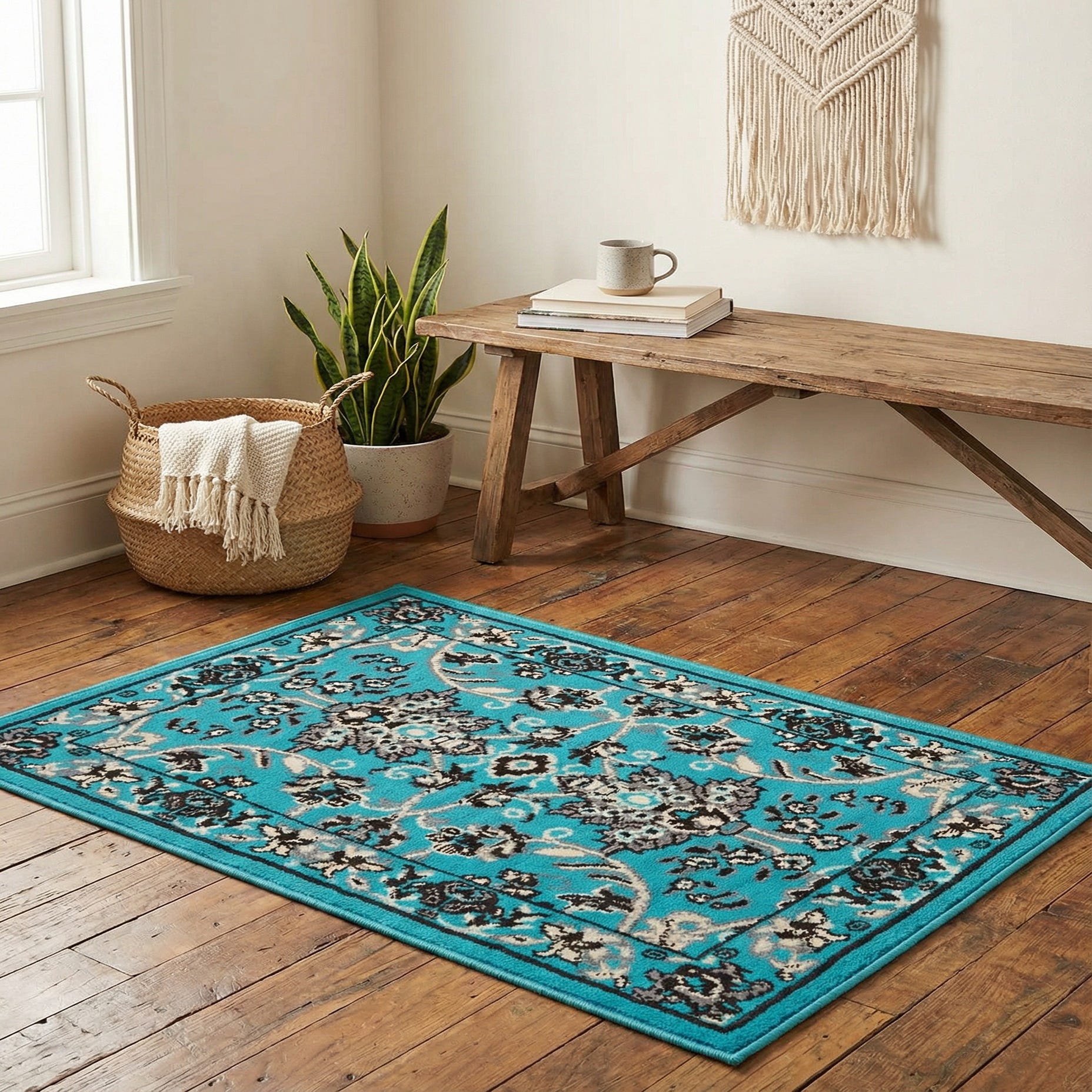 This compact accent works well in small entryways, in front of a sink, beside a bed, or layered over a larger neutral rug to introduce color and pattern. It pairs naturally with light wood floors and gray or white upholstery, and the black details coordinate with metal accents or darker furniture for a balanced look. The turquoise brings a lively color pop to coastal, modern-traditional, or eclectic interiors.