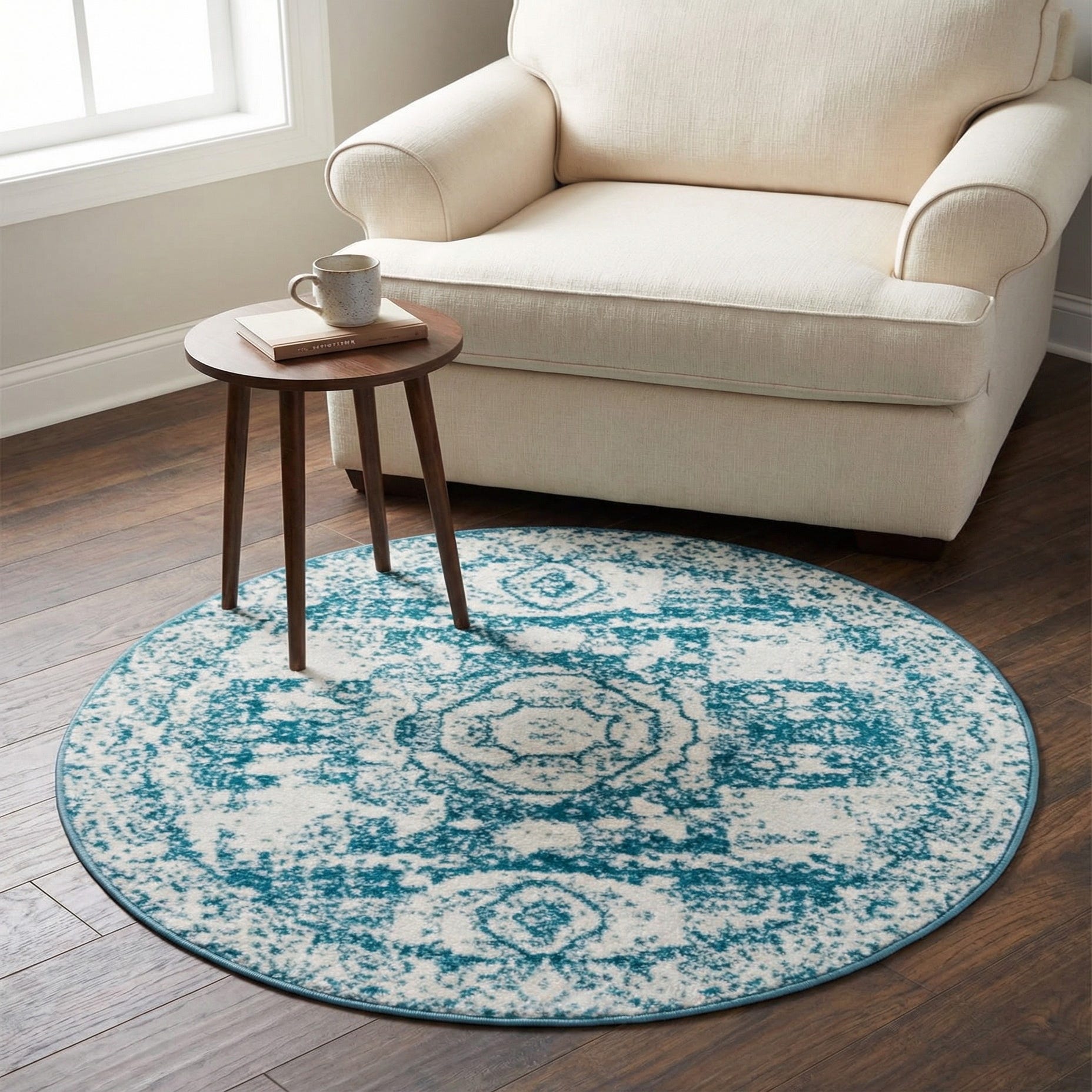 A round rug with a vintage-inspired medallion softened by a distressed finish, this piece pairs a turquoise field with ivory highlights that trace floral and geometric motifs. The pattern is intentionally weathered, creating a layered look where the ivory accents float across the turquoise background. Machine-made from 100% polypropylene, the cut pile has a low-to-medium height that feels softly dense underfoot and shows subtle textural variation where the design fades.
