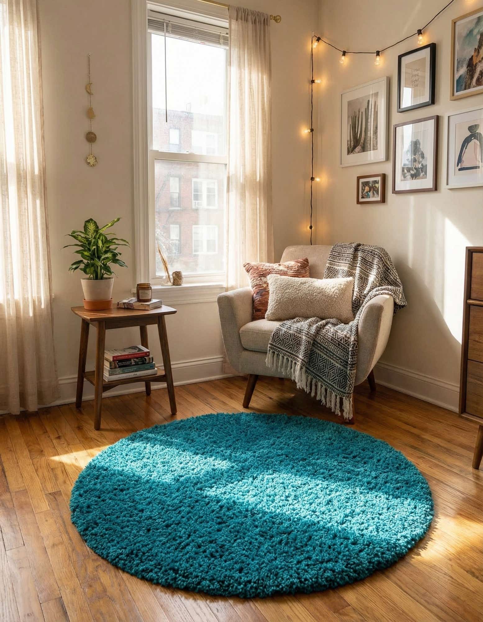 This rug works well as a bedside accent, a cozy layer beneath a small seating group, or a playful pop of color in a nursery or kids’ room. Pair it with light woods and neutral linens for a relaxed, coastal-inspired look, or combine it with navy and coral accents for a more energetic contemporary palette.