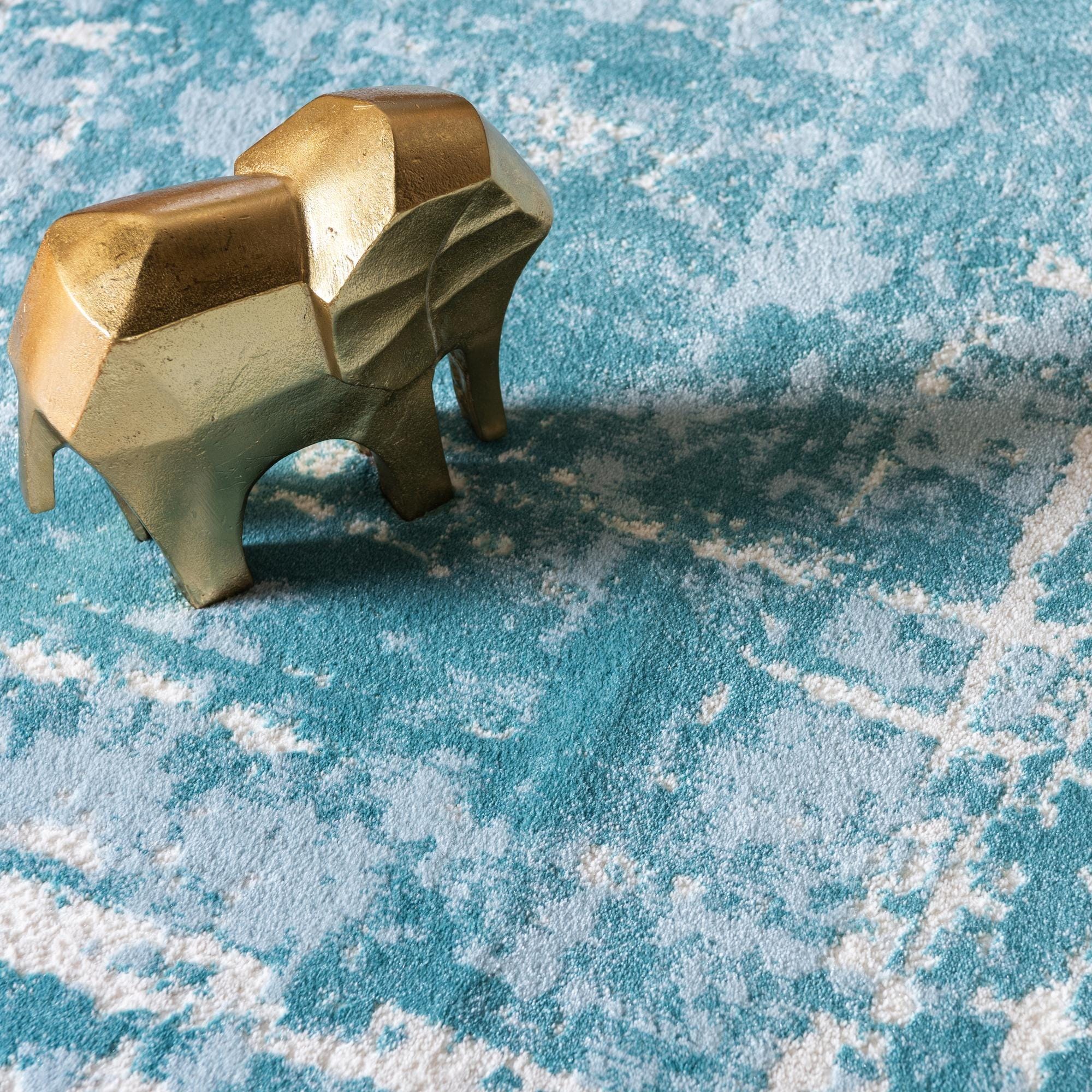 A soft, low-pile rug with an abstract, distressed pattern set against a turquoise background. Scattered ivory and light blue accents create a cloudlike, painterly effect that adds visual texture without overwhelming a space. Machine-made from 70% polypropylene and 30% polyester, the pile has a slightly velvety hand from the polyester while the polypropylene lends a smooth, even finish—comfortable underfoot and visually light in scale.