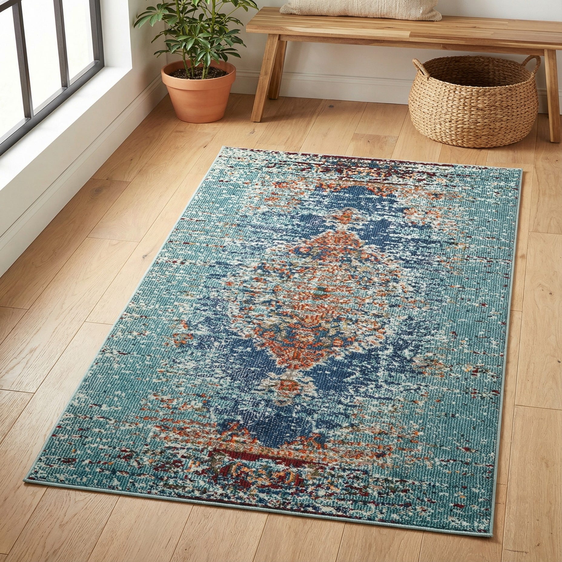 Machine-made from 100% polypropylene, the rug has a low-profile pile with a soft, slightly cushioned hand underfoot and an even, consistent weave. Its colorway and relaxed vintage feel work well in coastal, bohemian, or eclectic living spaces; pair it with light woods and rattan for a breezy look, or with navy and warm-toned leathers for a more grounded scheme. Sized for compact areas, it’s a good choice for entryways, a small seating nook, in front of a console, or at the foot of a bed to introduce a burst of color and pattern.