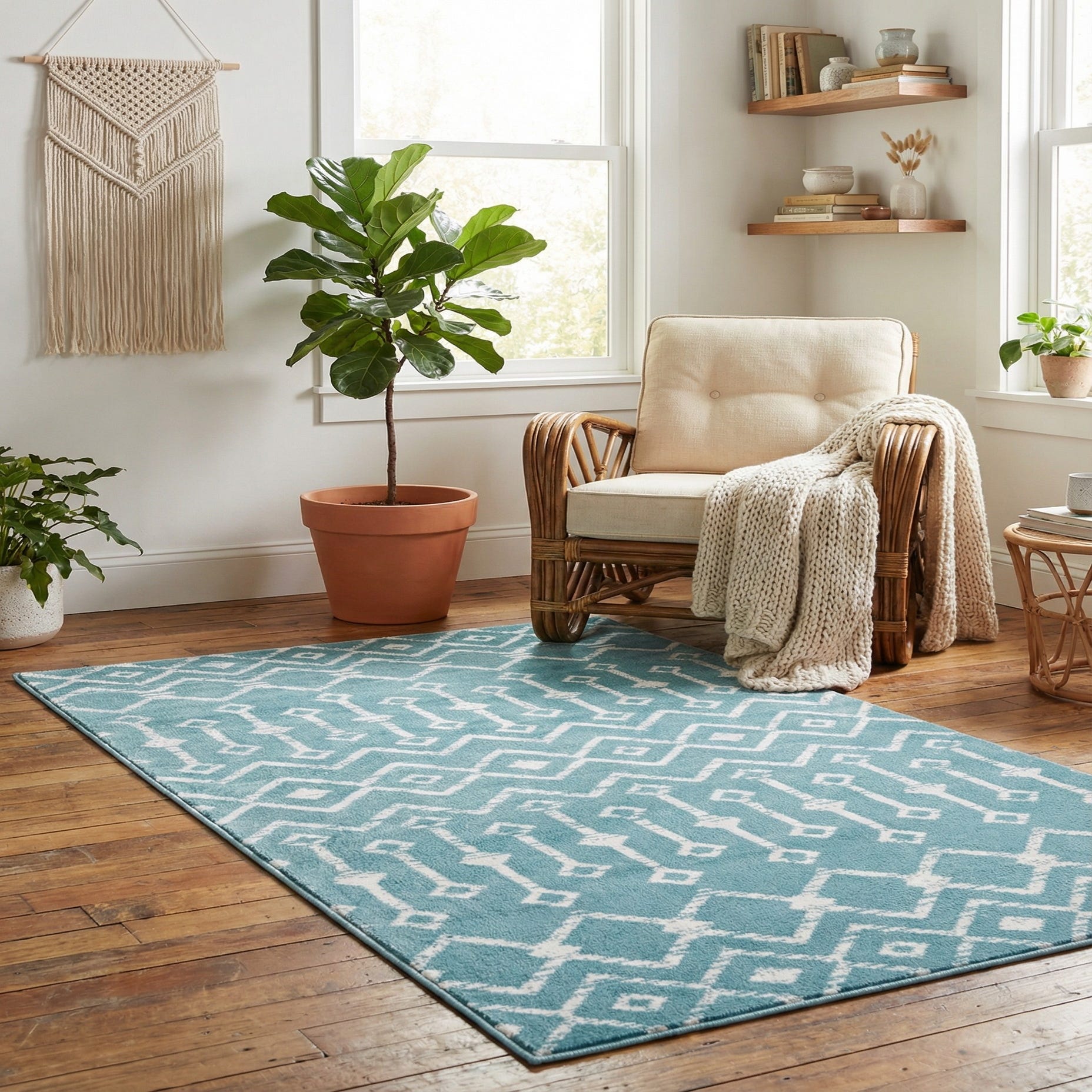 Machine-made from 100% polypropylene, this rug presents a bold turquoise field grounded by an ivory geometric trellis. Rows of diamonds, zigzags and elongated medallion-like motifs alternate across the surface in a slightly distressed finish, giving the pattern a hand-drawn, global-inspired look. The low-to-medium pile feels soft and slightly springy under your hand, with a subtle sheen from the polypropylene fibers that keeps the texture approachable and easy to layer into a room.