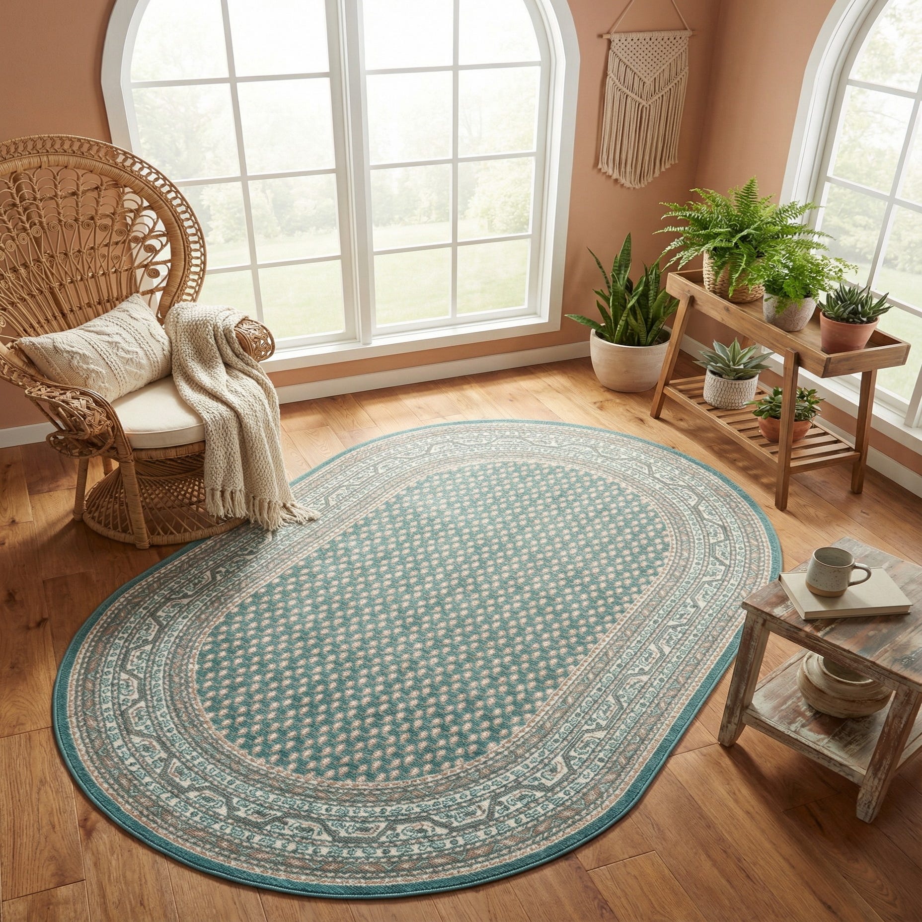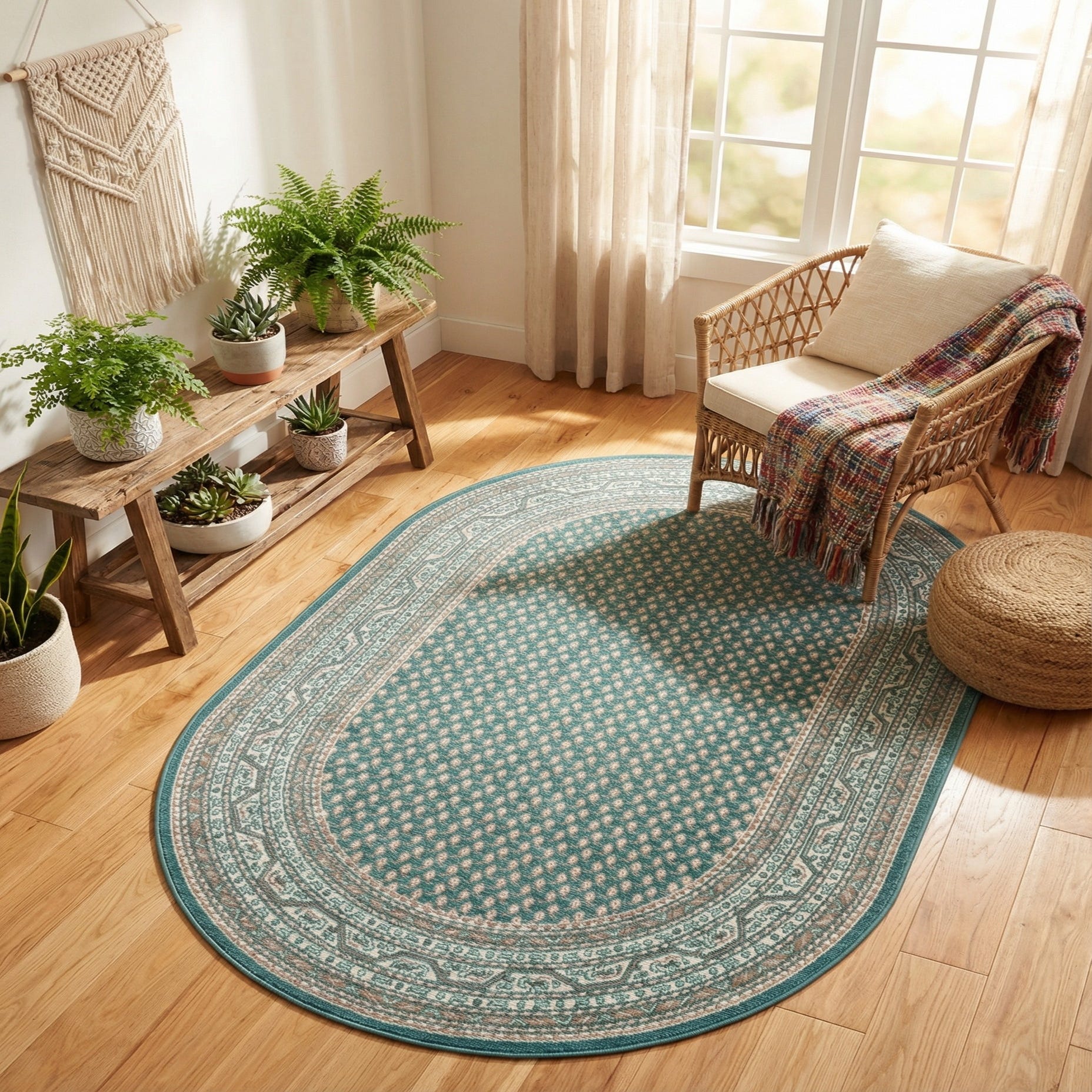 Machine made of 100% polypropylene, the rug has a low, dense pile that feels smooth and slightly cushioned underfoot. Its oval shape works well in entryways, at the foot of a bed, beside a sofa, or under a small round table. Style pairings include coastal or cottage interiors with white trim and light wood, casual traditional spaces with soft linens and warm wood tones, or a transitional living area where turquoise accents and ivory furnishings tie the room together.