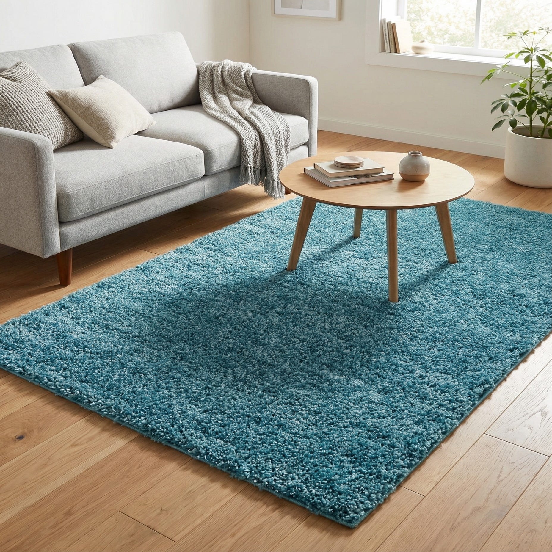 A lush, solid turquoise shag with a dense, cut pile that invites bare feet. The single-color field creates a clean, contemporary silhouette while the thick polypropylene fibers give the surface a soft, plush hand and a gentle, light-catching sheen. Close up, the pile shows subtle tonal variation that adds visual depth without a printed pattern, making the rug feel both simple and tactile.