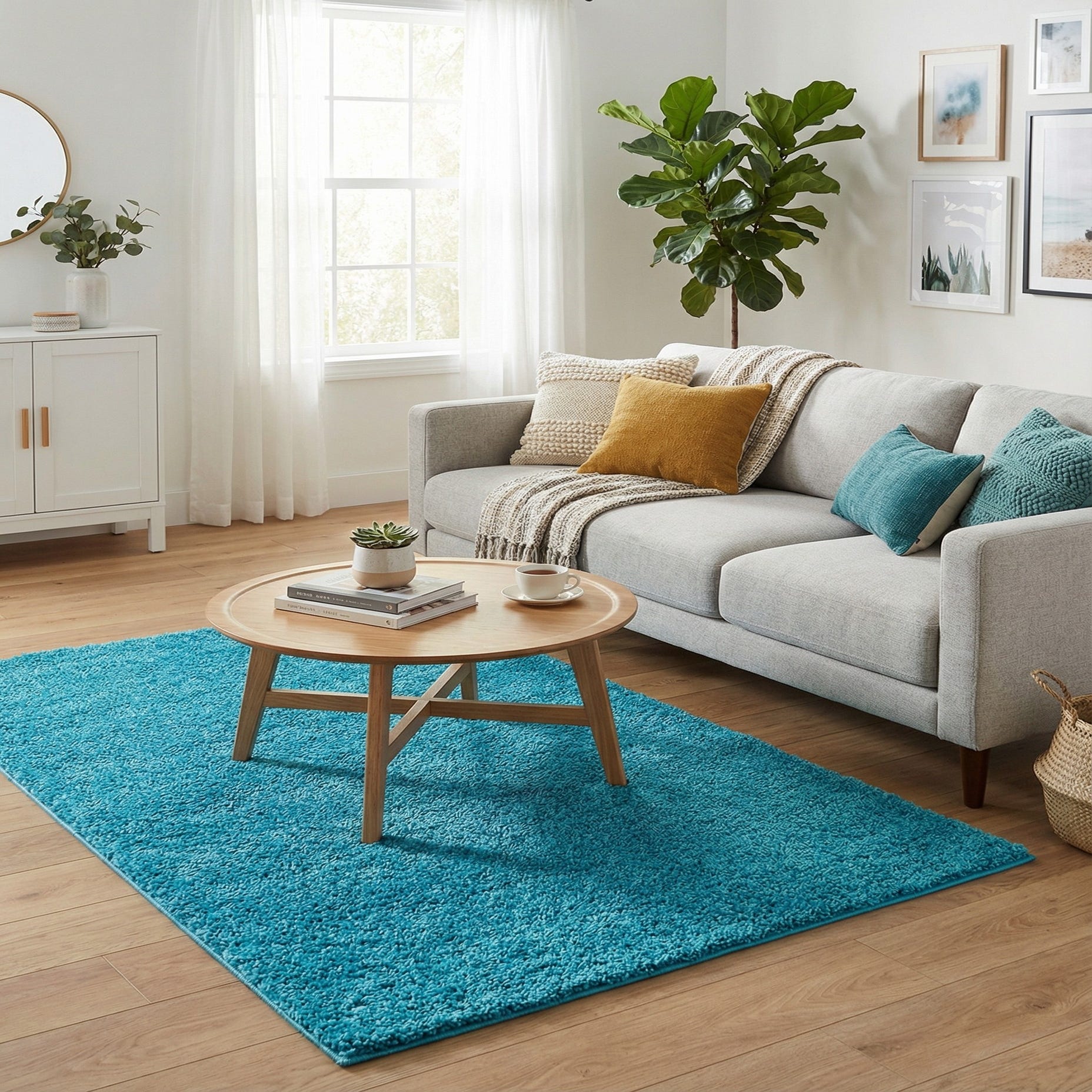A solid turquoise field in a rich, true tone gives this frieze rug a clean, confident look. The dense, twisted pile creates a softly textured surface that invites bare feet and resists showing foot traffic. Machine-made of 100% polypropylene, the rug delivers a consistent pile height and color saturation across the surface for a dependable, even appearance.