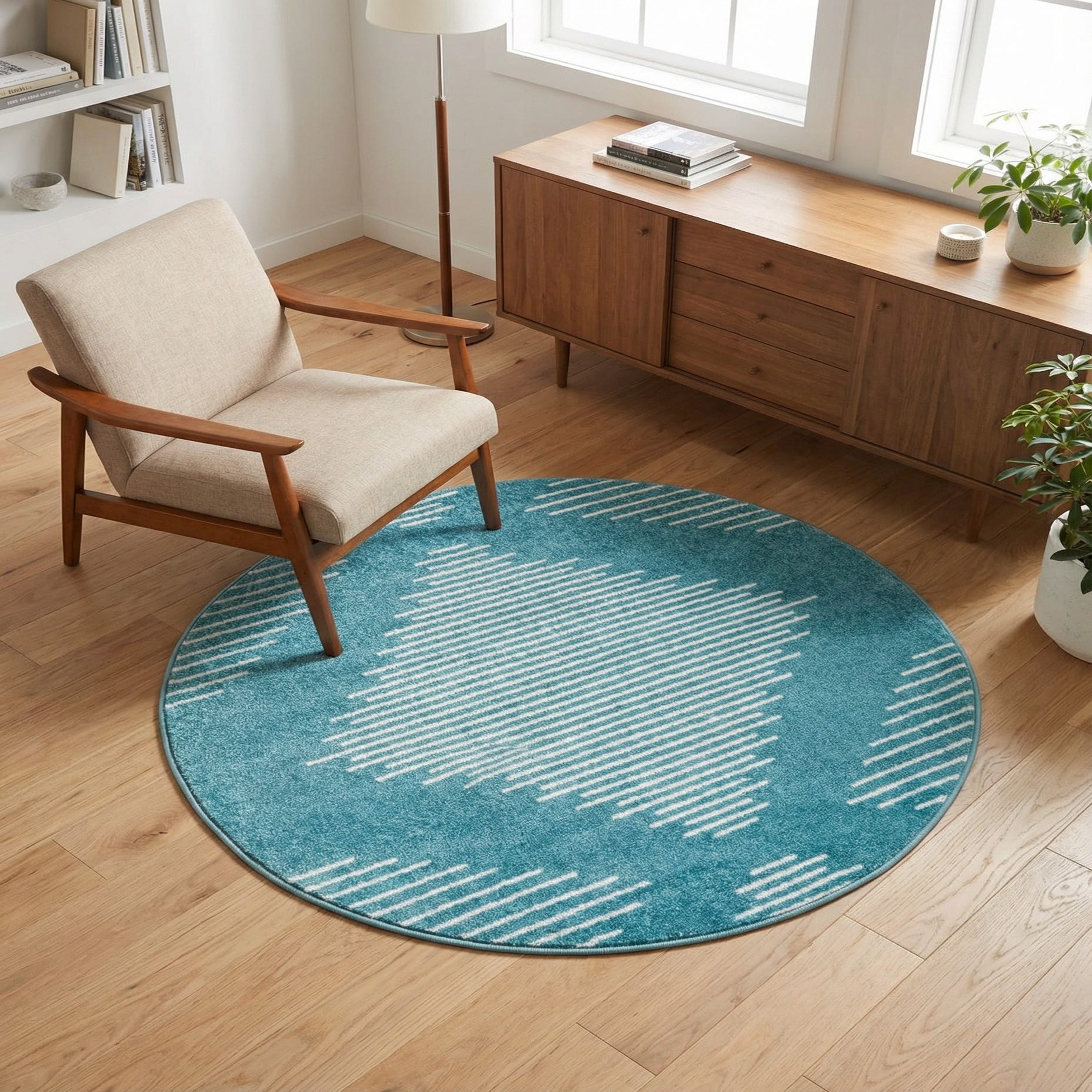 This round rug presents a turquoise field interrupted by a clean, ivory linear motif. Horizontal ivory lines stack to form a stepped diamond at the center, with matching trimmed stripe groups near the perimeter for a balanced, geometric composition. Machine Made of 100% Polypropylene, the surface has a low, smooth pile with a soft hand and a subtle sheen that feels pleasant underfoot while keeping the pattern crisp.
