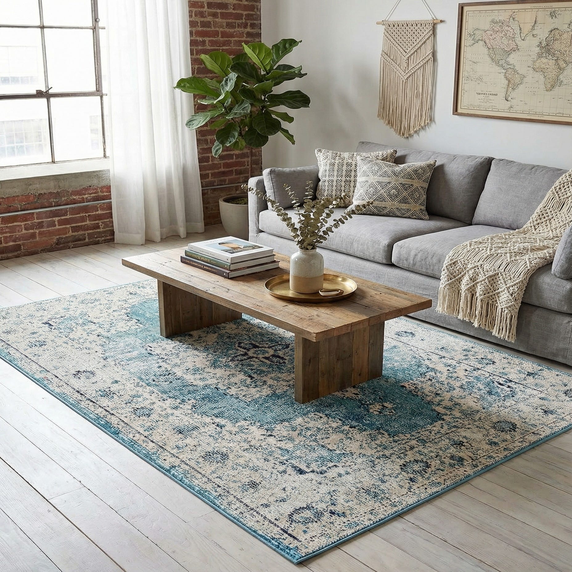 Machine made from 100% polypropylene, the rug has a low, tightly woven pile that feels smooth and slightly firm underfoot, with a subtle sheen where the fibers catch the light. Its durable construction and cool turquoise palette make it a good choice for a small seating area, entryway, or layered over a larger neutral rug. Pair it with light wood furniture, navy or cream textiles, and brass or matte-black metal accents for a coastal, transitional, or relaxed modern interior.