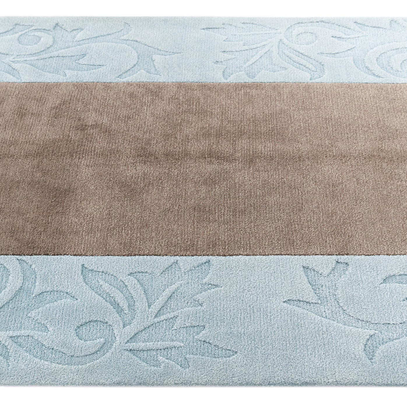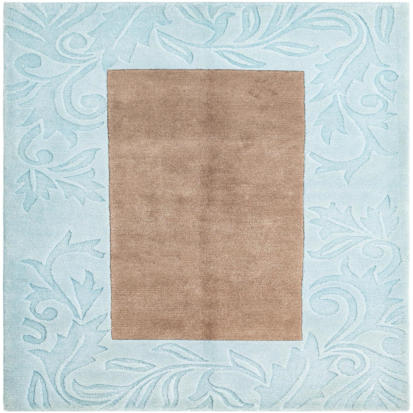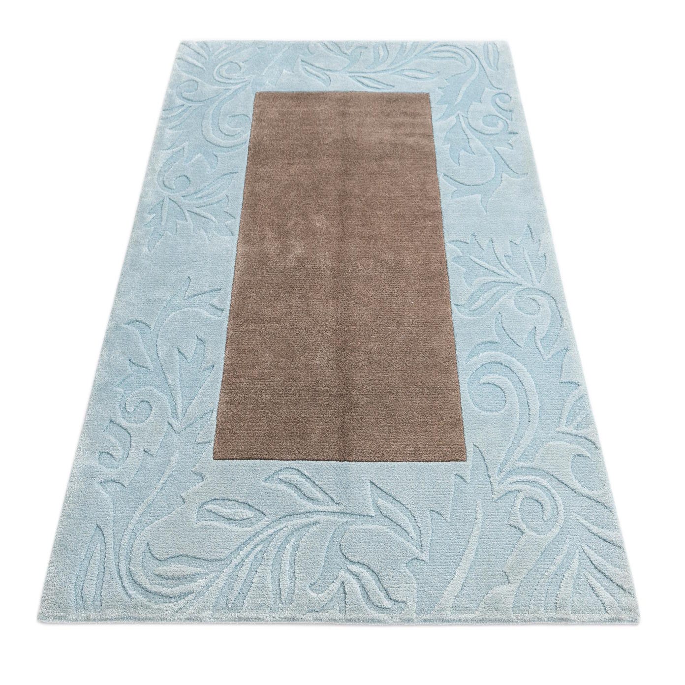 A 4x6 rectangular blue and brown rug with a raised floral border pattern, ideal for a living room.