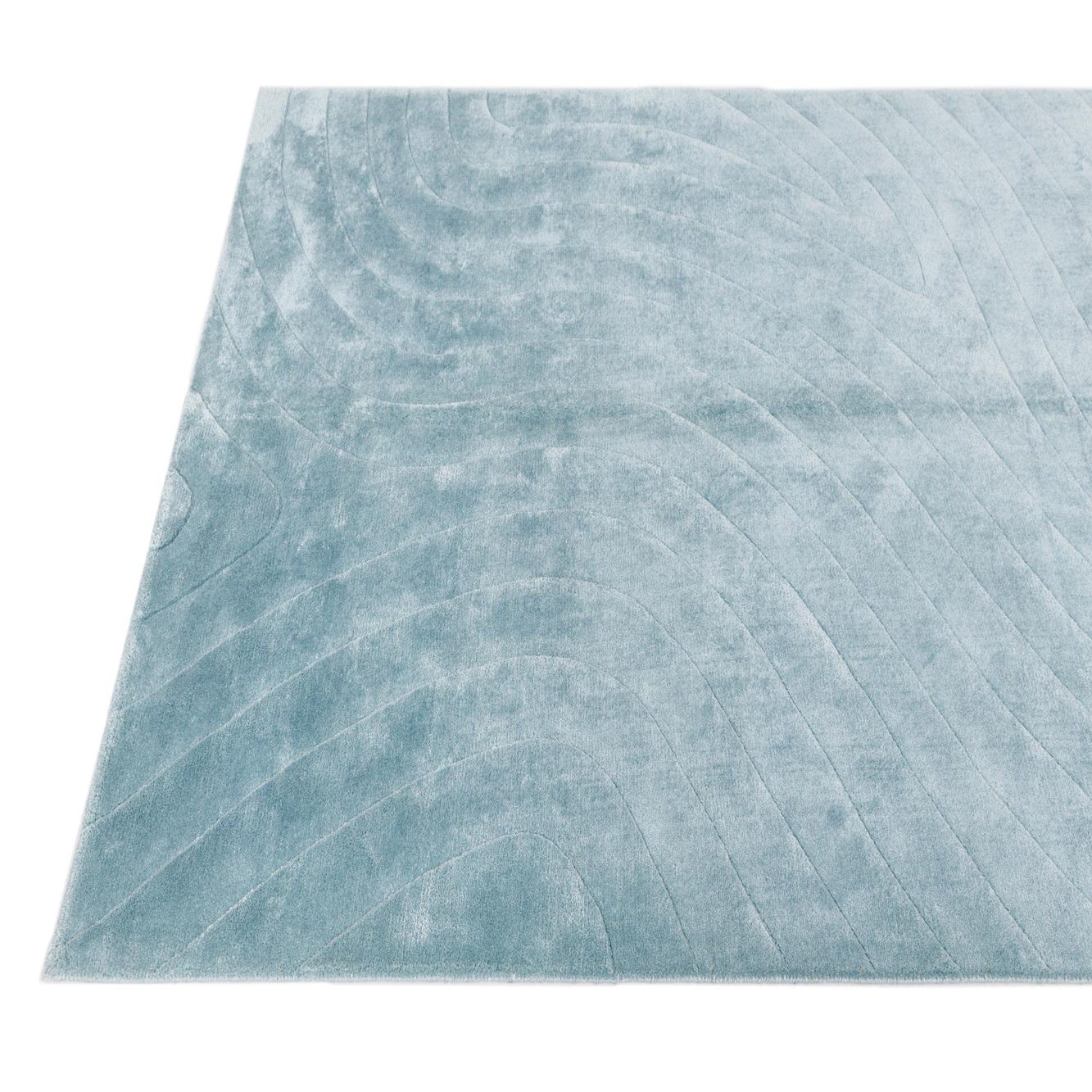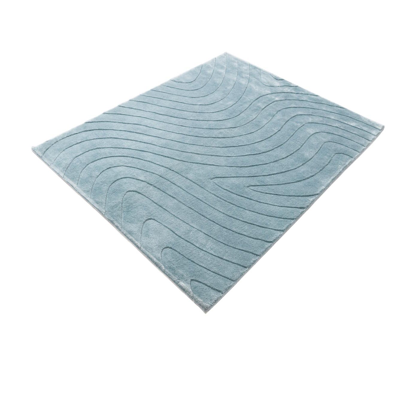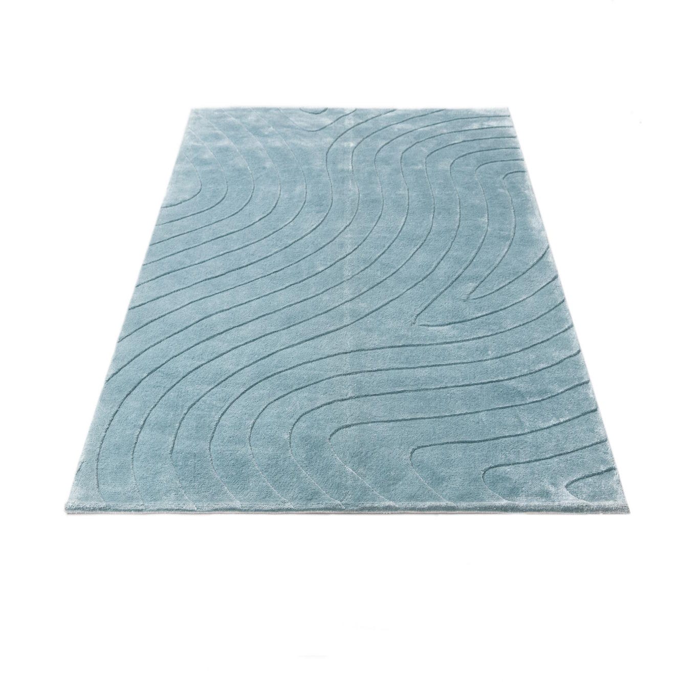 A 4x6 rectangular blue wool rug with a high pile and a modern, flowing wave pattern.