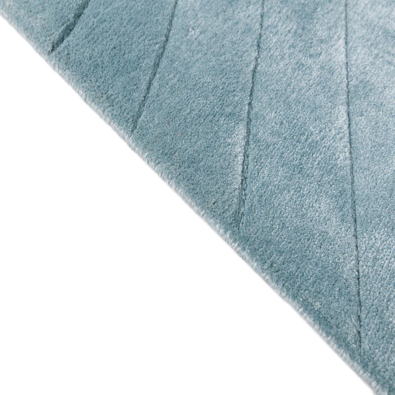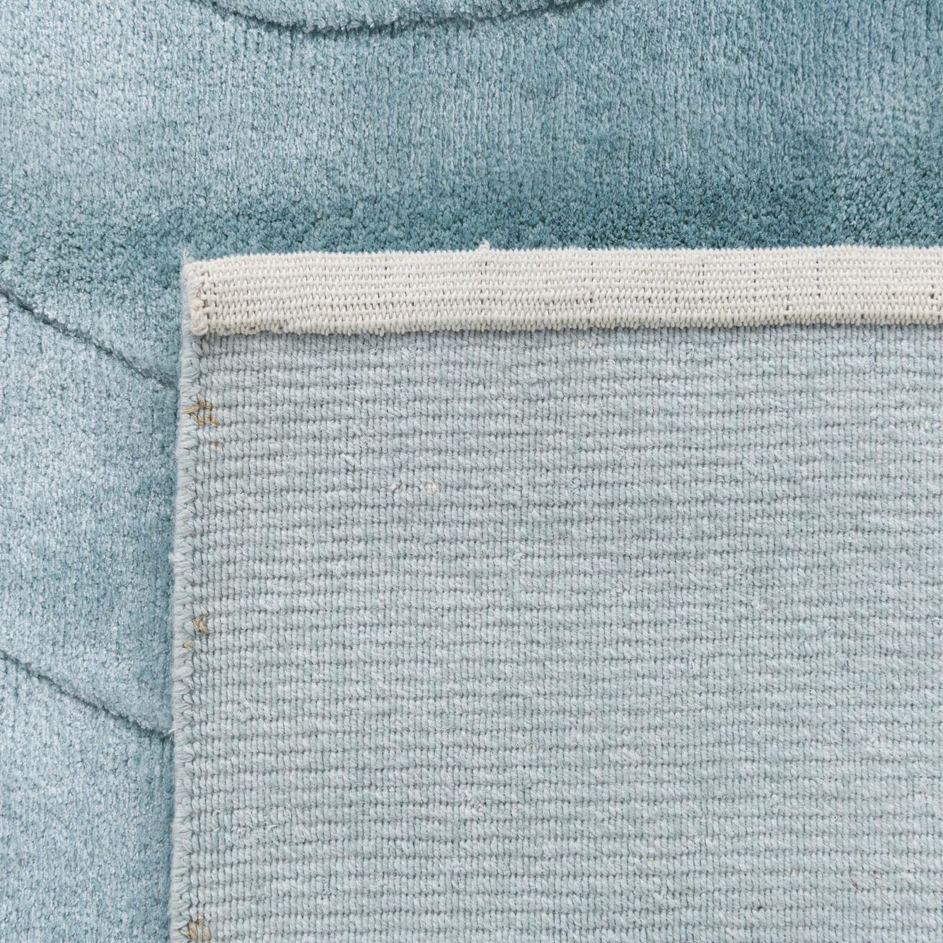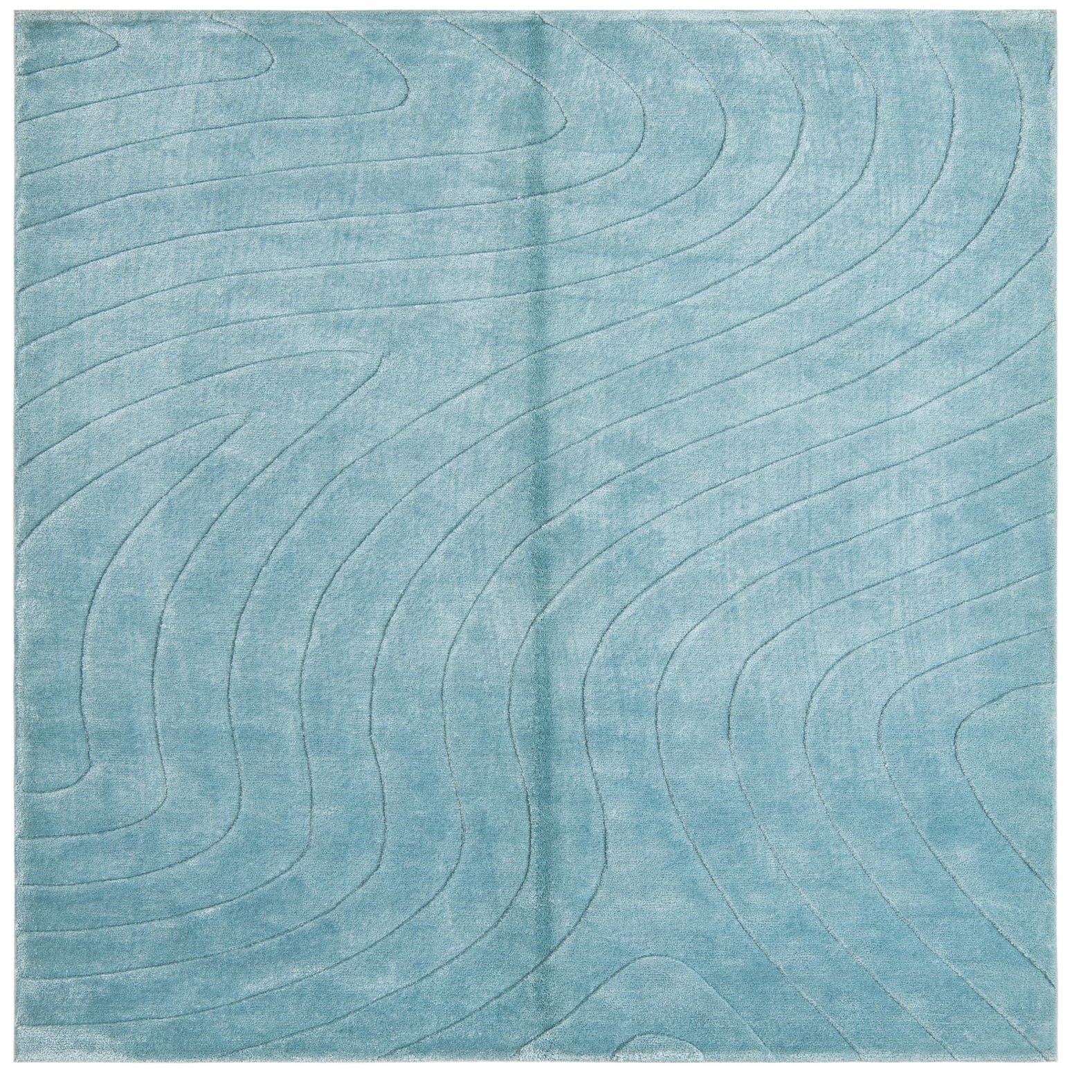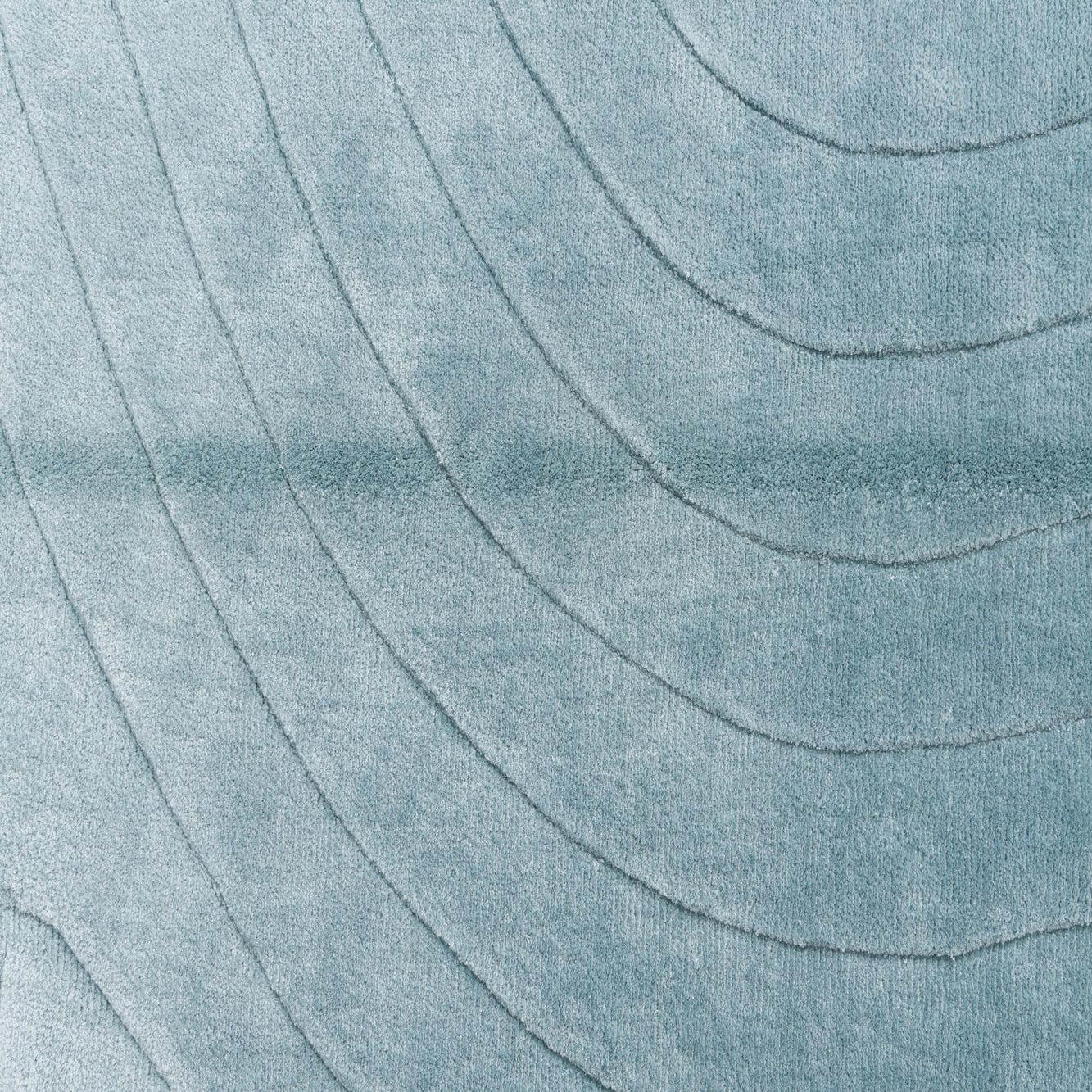 A 4x6 rectangular blue wool rug with a high pile and a modern, flowing wave pattern.