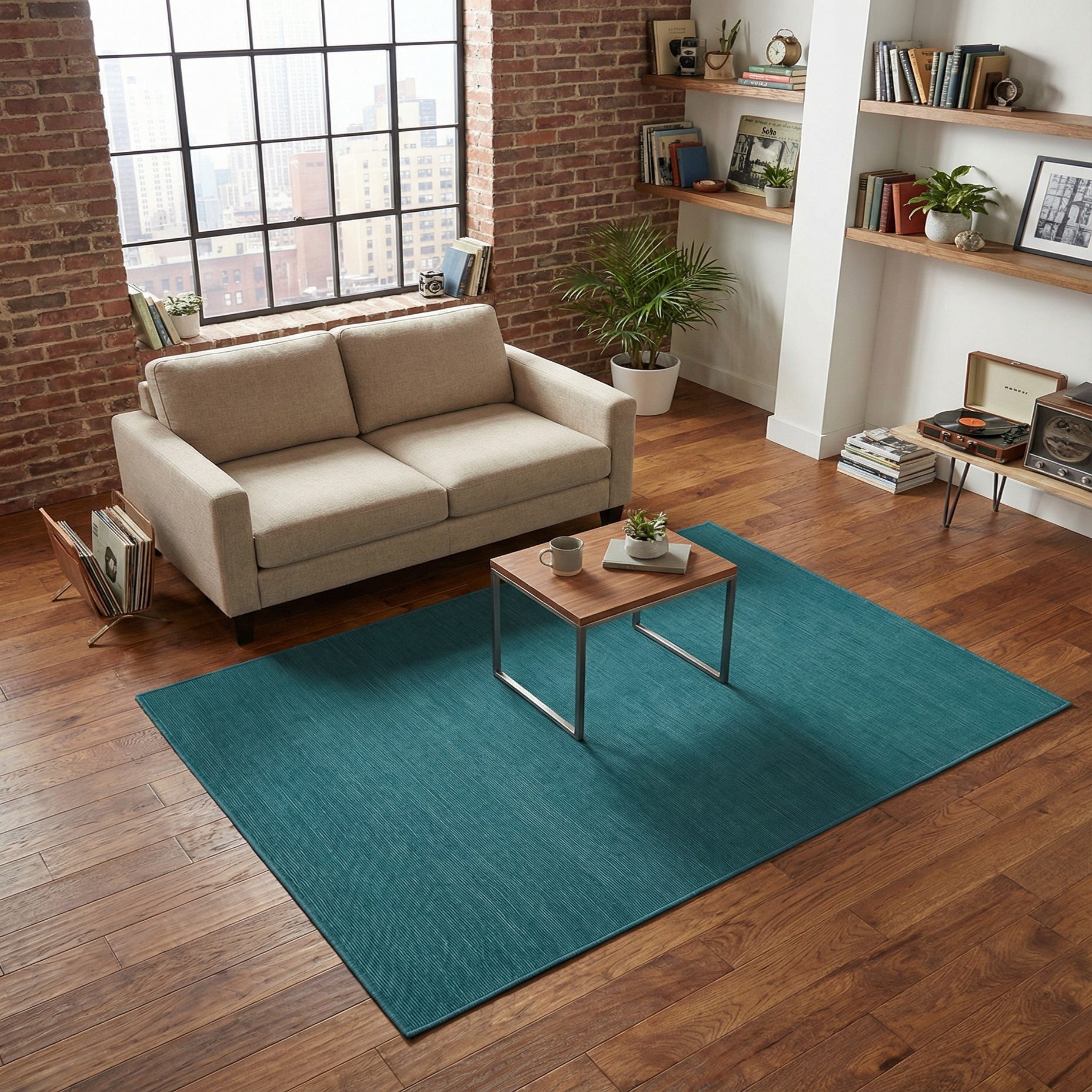 Machine made from 100% polypropylene, the construction yields a smooth, durable finish that lays flat and holds a clean, tailored edge. This piece is well-suited to contemporary living rooms or a bedroom layered beneath a bed, and it pairs easily with natural woods, warm brass accents, or crisp white furnishings for a coastal or mid-century modern vibe. It also works nicely in a home office or dining space where a splash of turquoise can define the area without overwhelming the room.