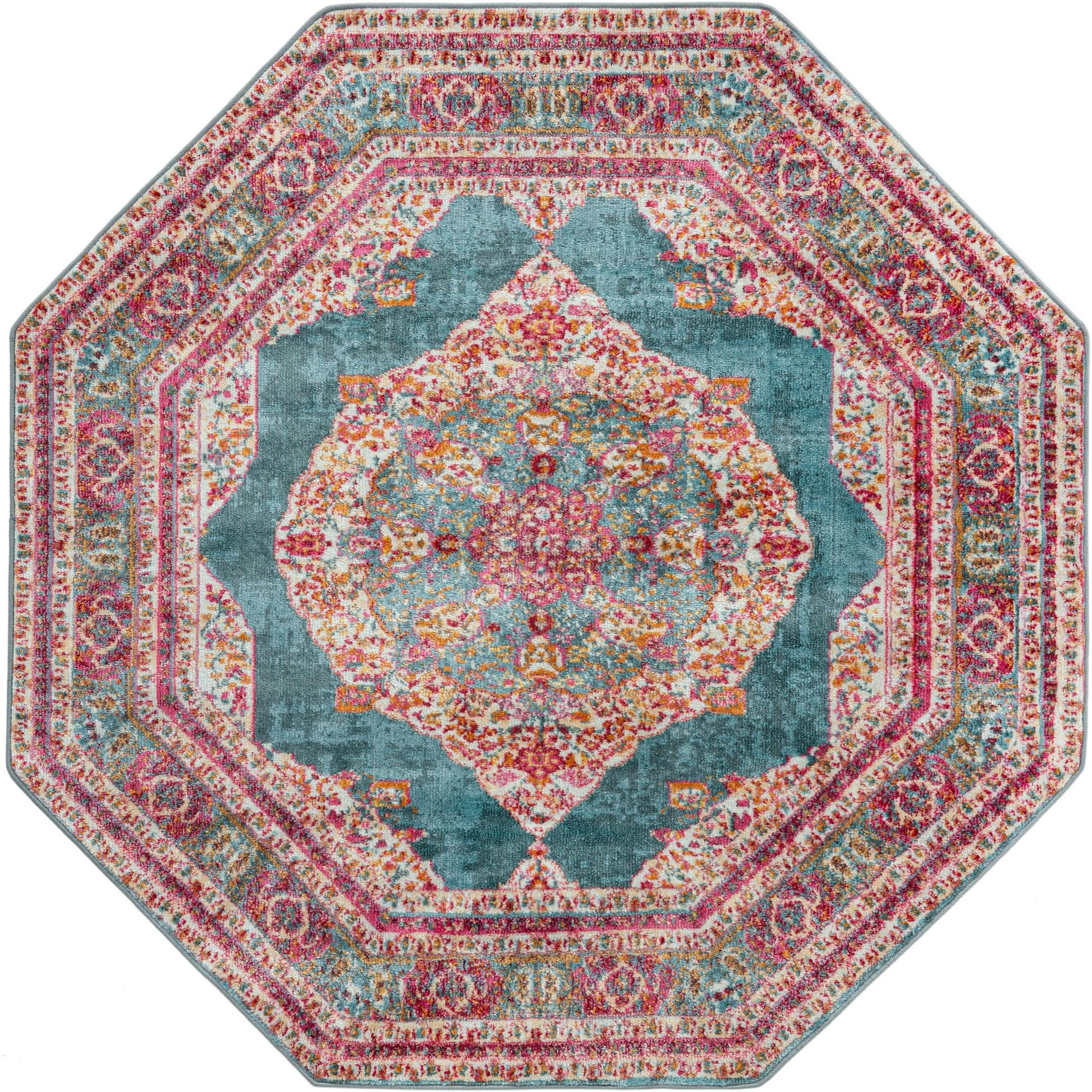 An octagonal silhouette frames a richly detailed central medallion set against a turquoise field, where layered floral and geometric motifs build a balanced, vintage-inspired look. Ivory highlights and pops of olive, orange, red, violet, and pink are worked into the medallion and surrounding borders, creating a lively, multi-hued tapestry that reads both classic and contemporary. The patterned border wraps the piece with repeating floral bands and fine detailing, giving the rug a collected, storied appearance.