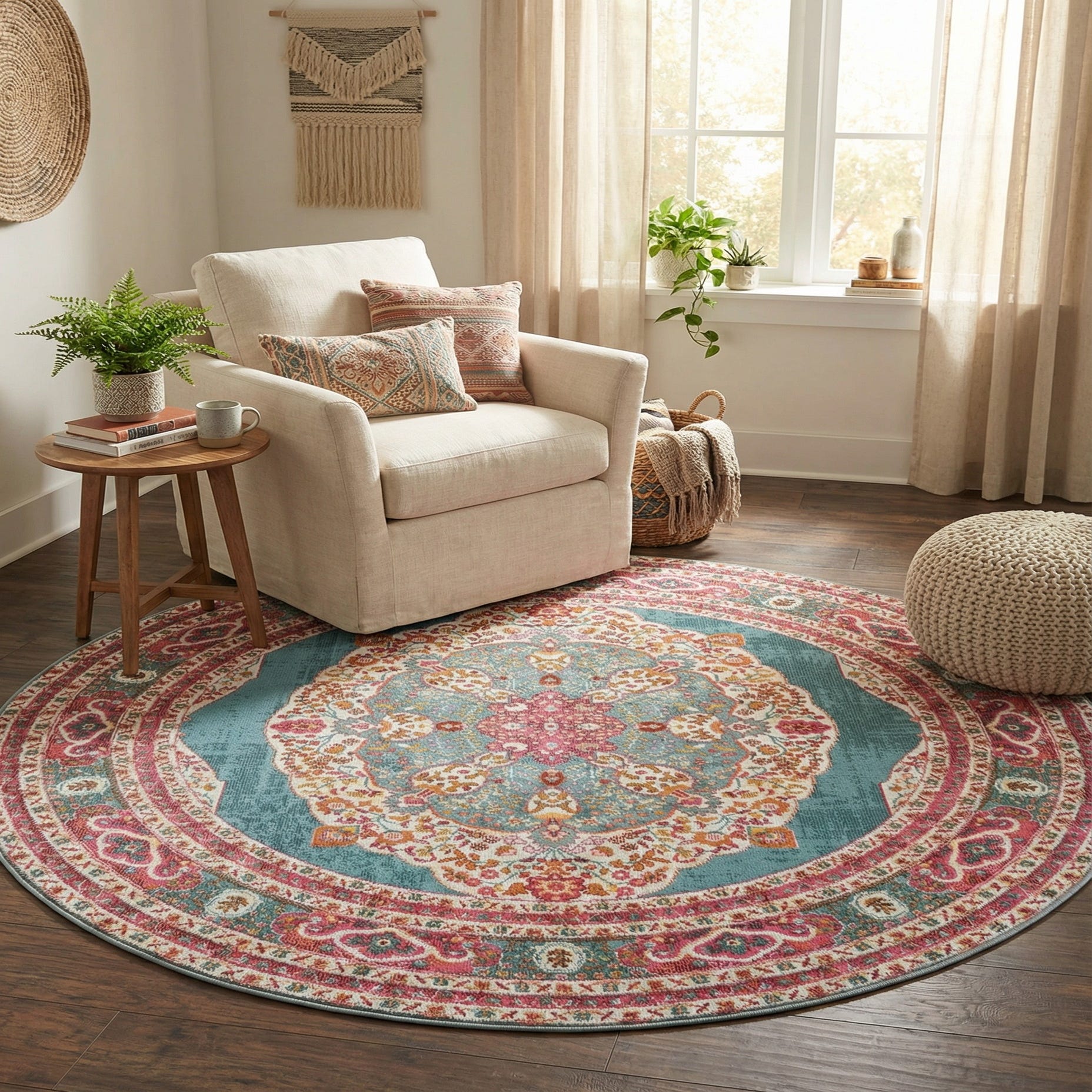 This round rug works well as an anchor beneath a circular coffee table or a small dining set, and it also brings color to a bedroom seating area or a sunlit entry. Pair it with warm wood tones and neutral upholstery to let the turquoise pop, or layer it into a bohemian or global-inspired scheme with rattan furniture, mixed textiles and brass accents for added warmth.