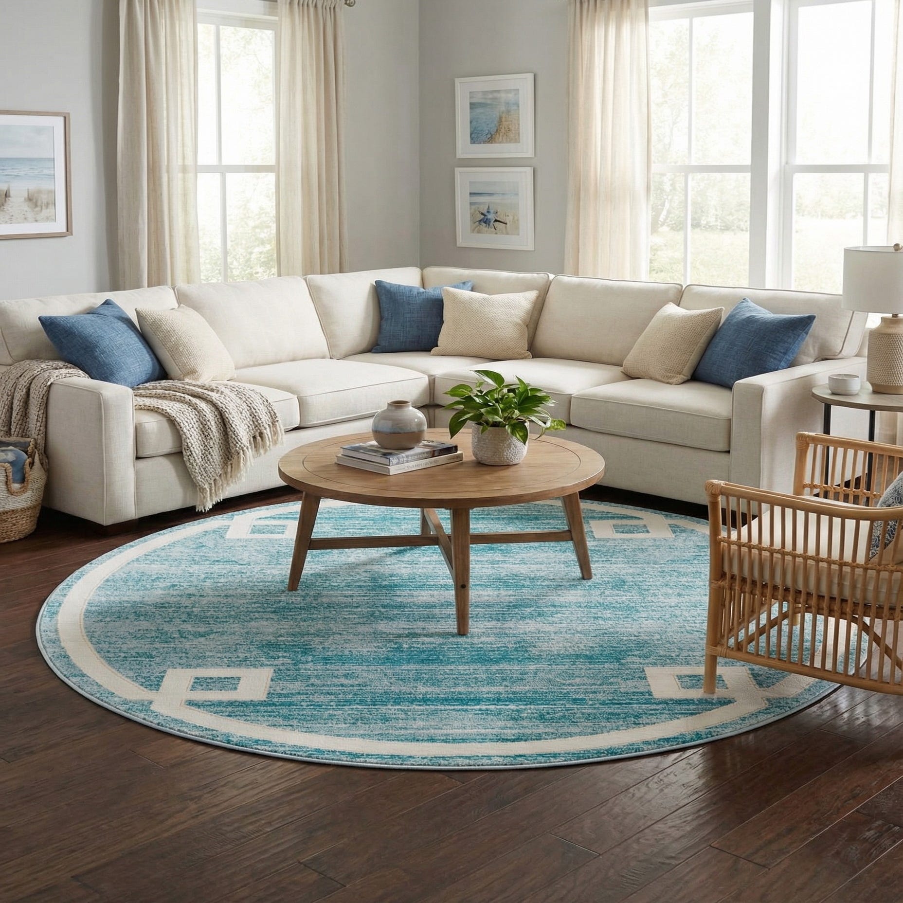A soft turquoise field with subtle, linear distressing gives this round rug a relaxed, lived-in look. An ivory geometric border — an arced band that meets squared corner motifs — provides clean, modern definition against the textured background. Machine-made from 70% polypropylene and 30% polyester, the low-pile surface has a gentle, slightly lustrous feel underfoot and a neat, uniform finish from edge to edge.