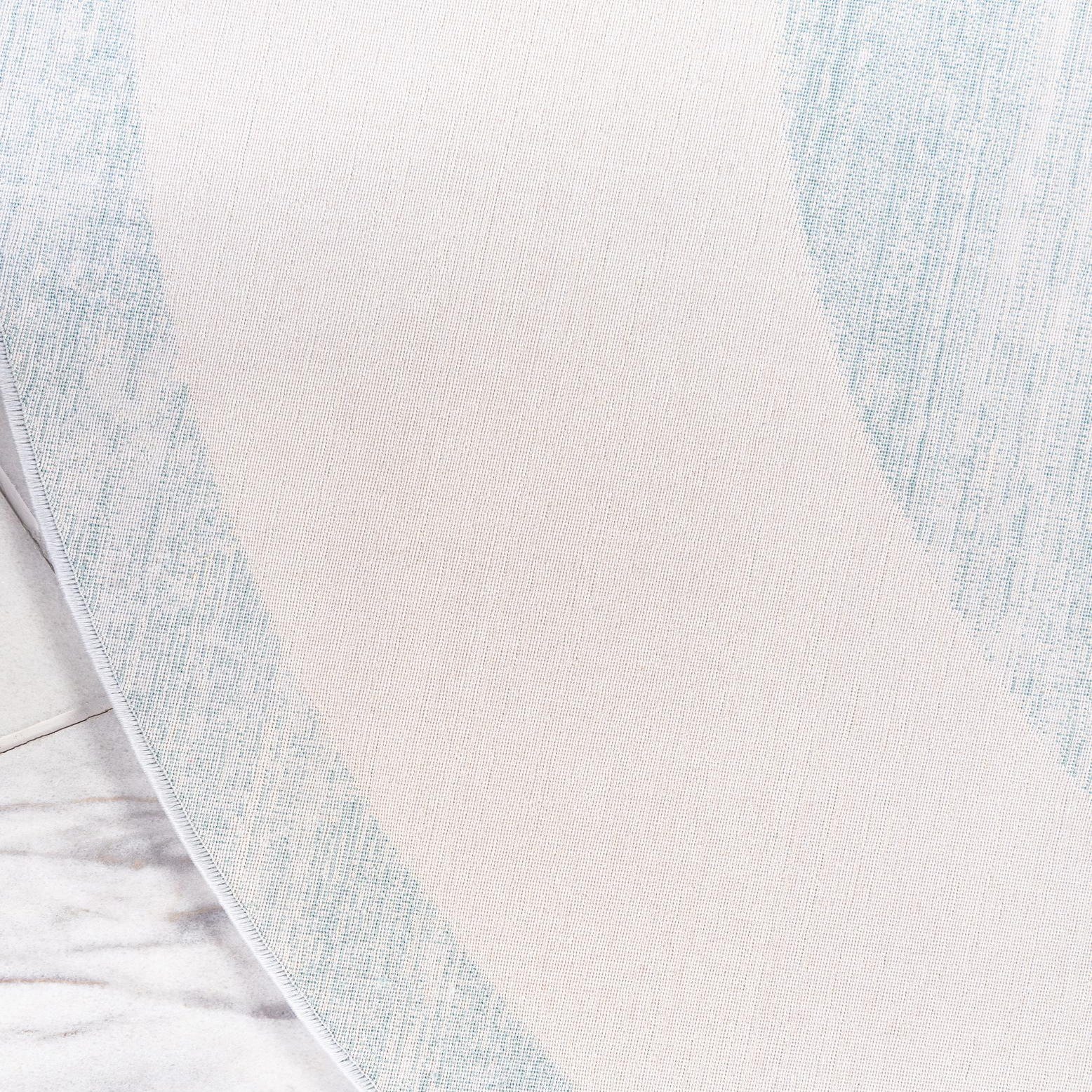 Circular symmetry and clean lines define this rug’s pattern: a broad turquoise field at the center framed by an ivory band and finished with a slim turquoise border. The background is turquoise, and the face shows a softly distressed, striated effect that gives subtle color variation across the surface. Machine made from 70% polypropylene and 30% polyester, it has a low-profile pile with a soft hand and a gentle sheen that settles neatly under furniture.