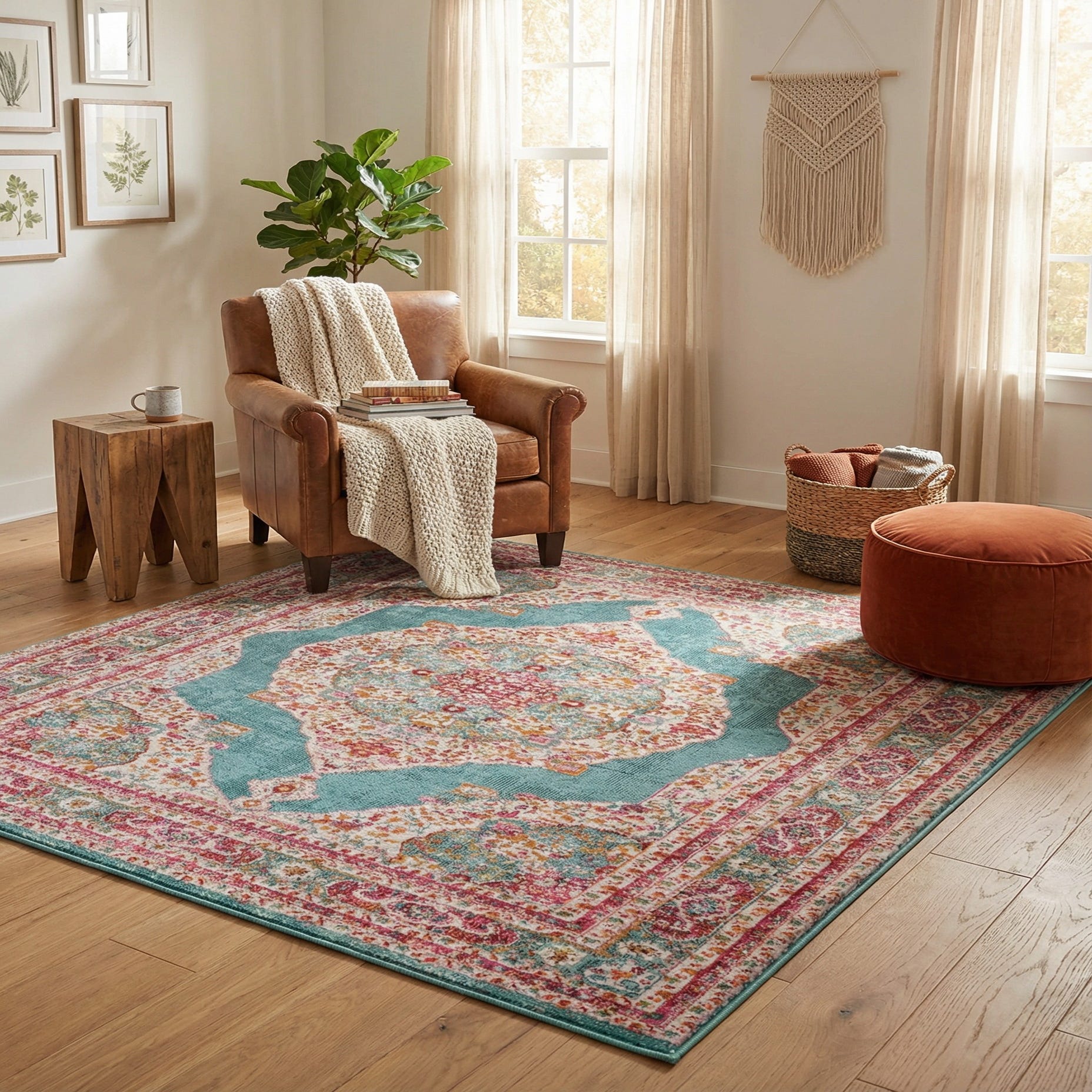 Use this rug to add color and pattern to a living room seating area — it pairs well with light woods, linen upholstery and rattan for a relaxed coastal or bohemian look. It also works in a bedroom to introduce a lively focal point at the foot of the bed, or in an eclectic or transitional space where vintage-inspired motifs and bright accents are desired.