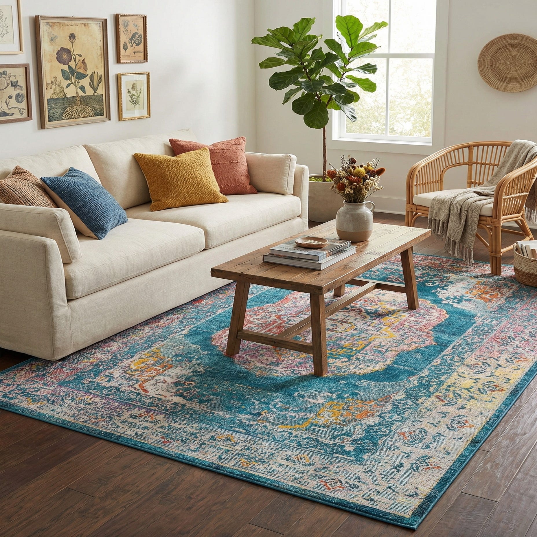 A vibrant central medallion anchors this rug on a turquoise field, surrounded by layered borders that carry an artful, worn-in look. Ornamental motifs in navy blue, gold, orange, red, pink and ivory are woven into the design, creating a balanced mix of warm and cool tones that read as both lively and grounded. The color layering and deliberate distressing give the pattern depth—details rise and recede across the surface so the medallion and border elements remain visually interesting from every angle.