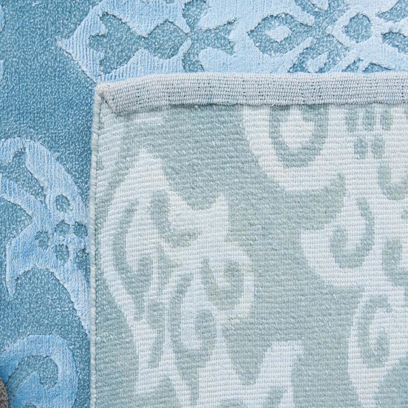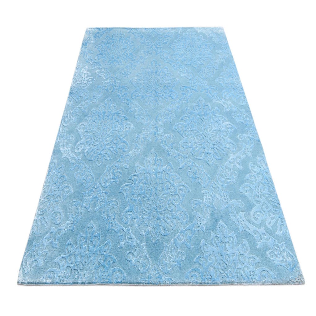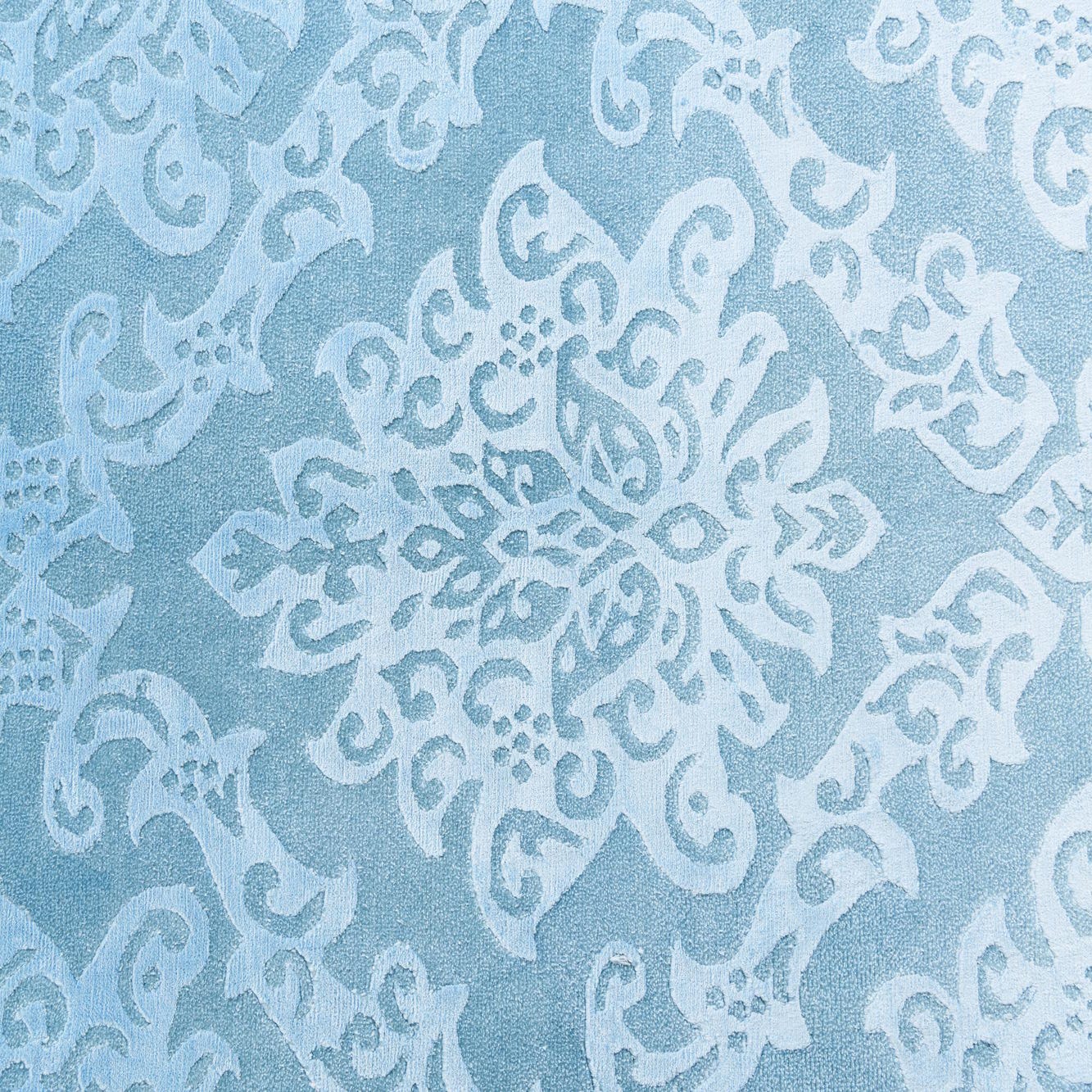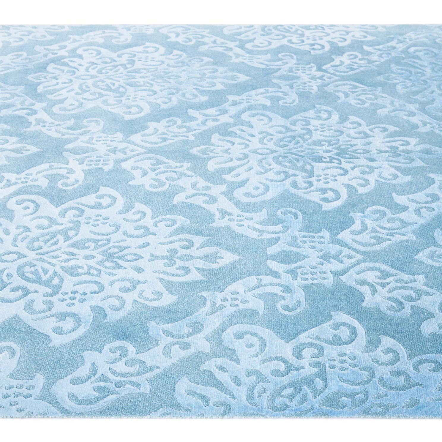 A 5x8 rectangular Darya rug by Rugs.com features a light blue background with an intricate white modern oriental pattern, showcasing its high pile and handmade wool texture.