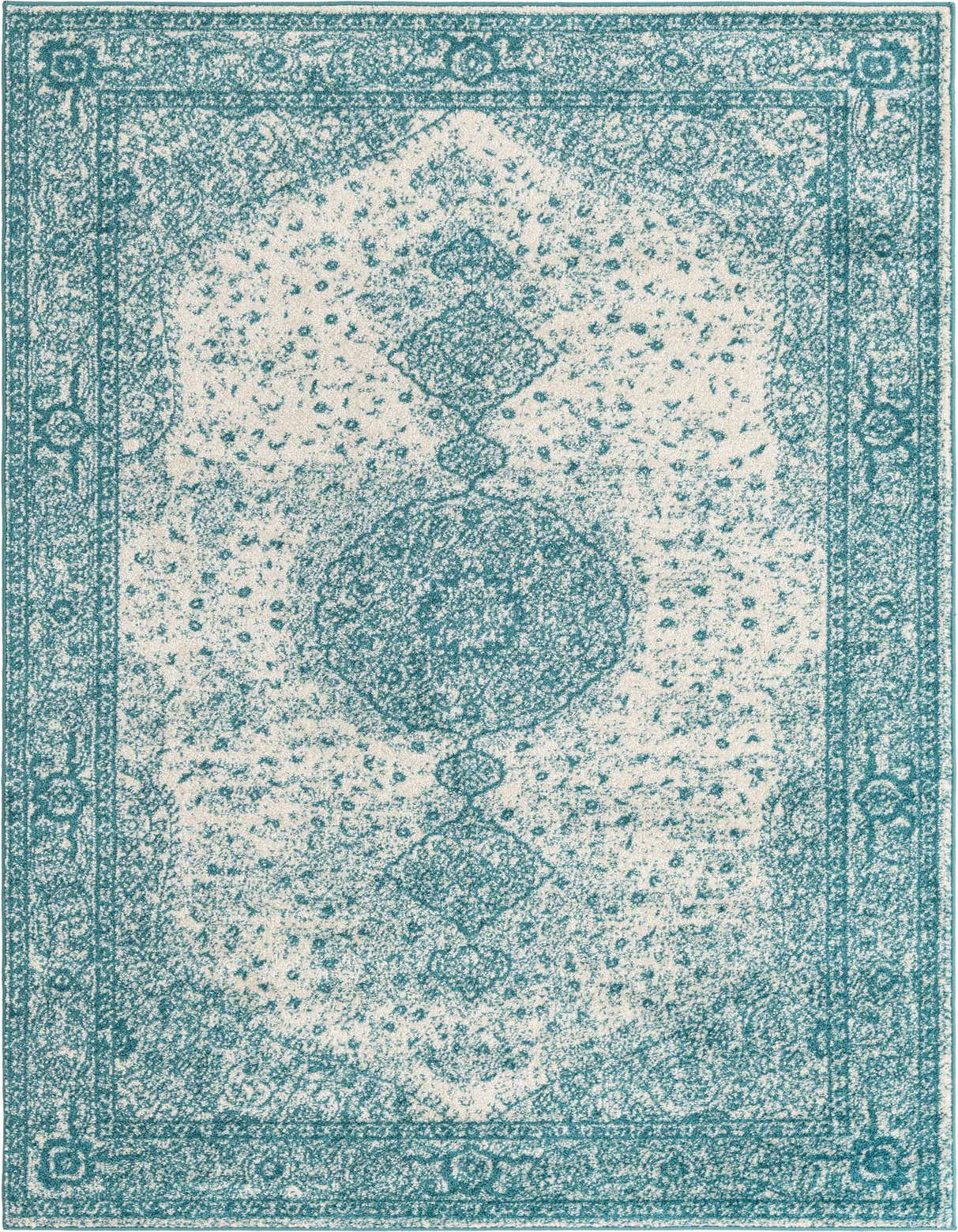 Primary color is Turquoise. Colors in this rug include: Turquoise, Ivory.