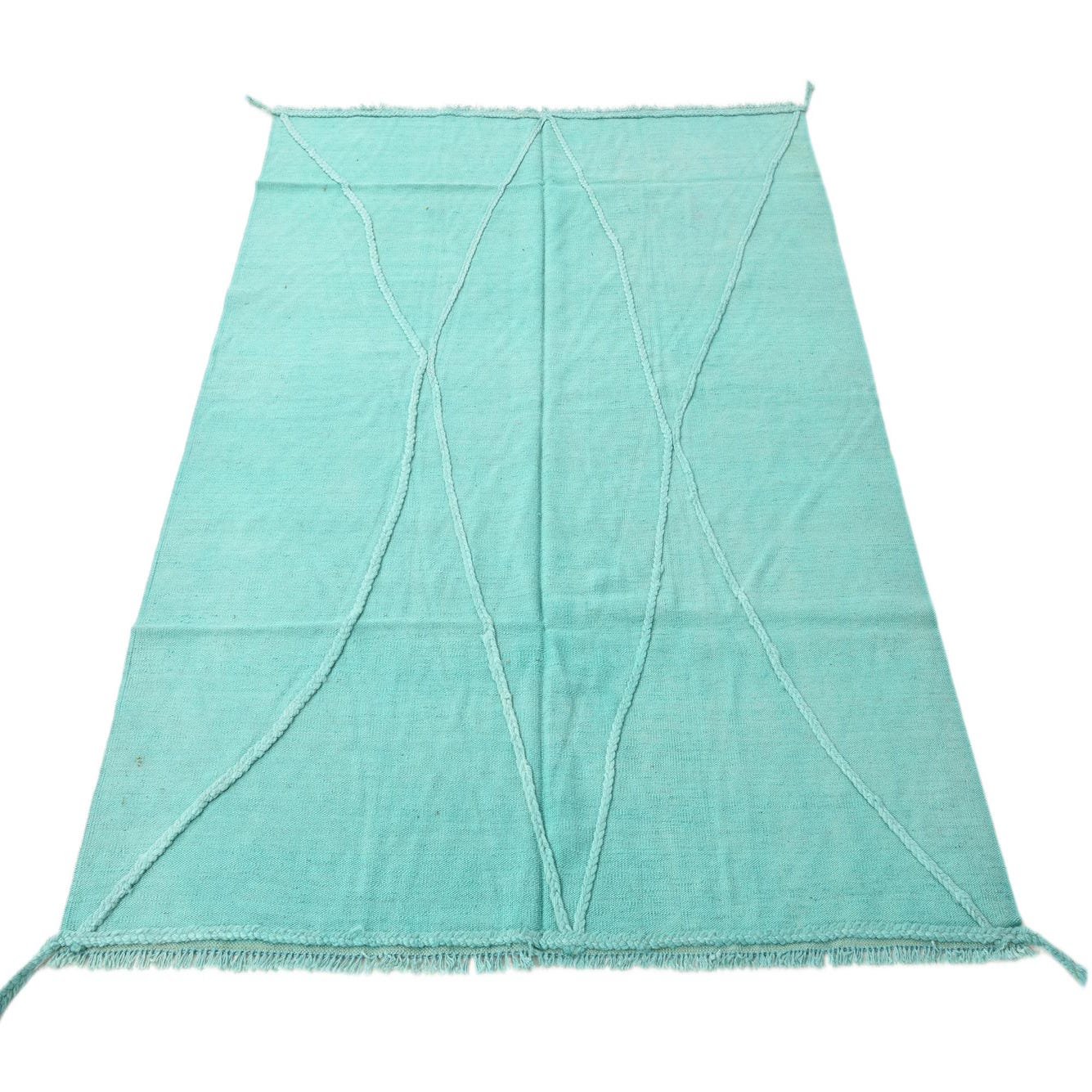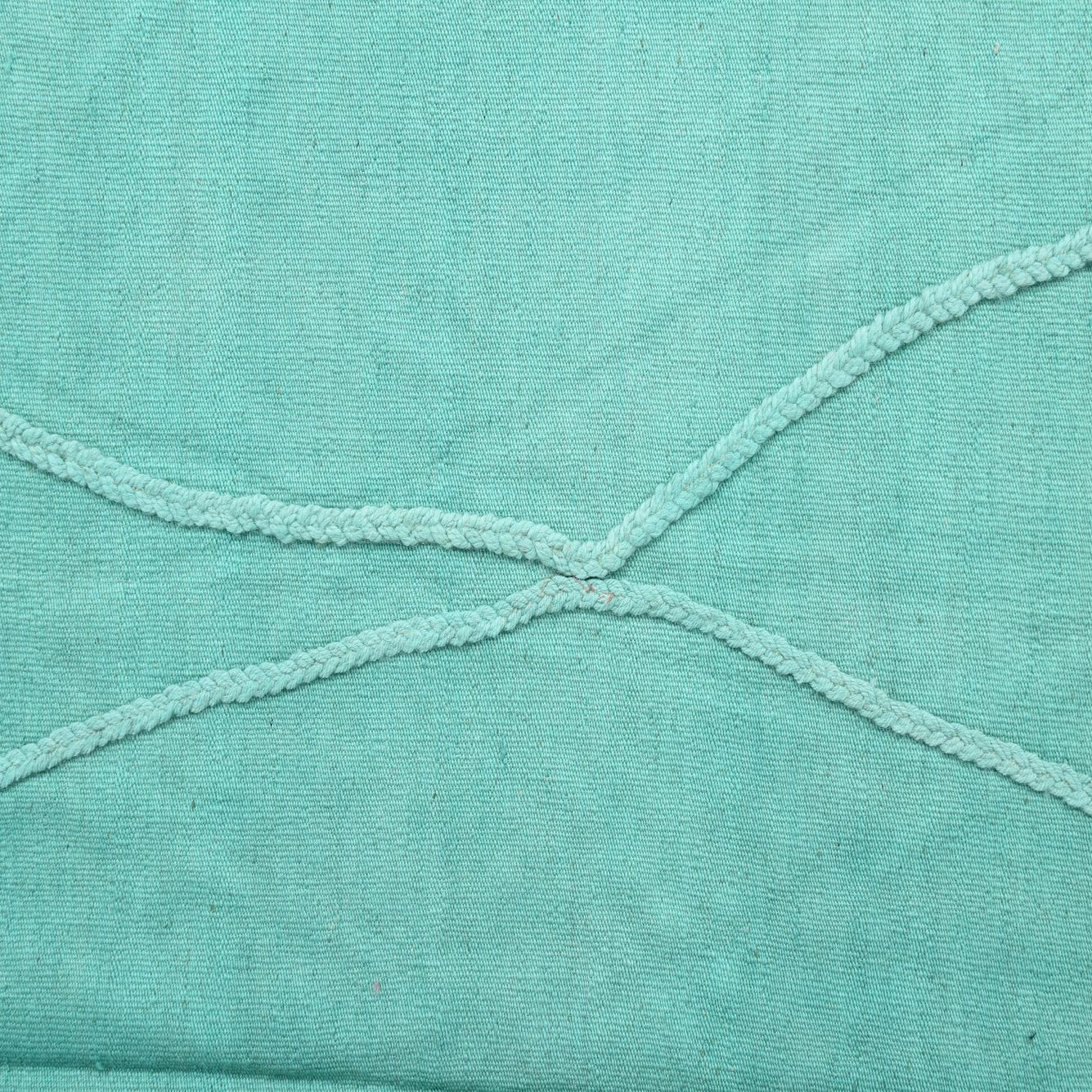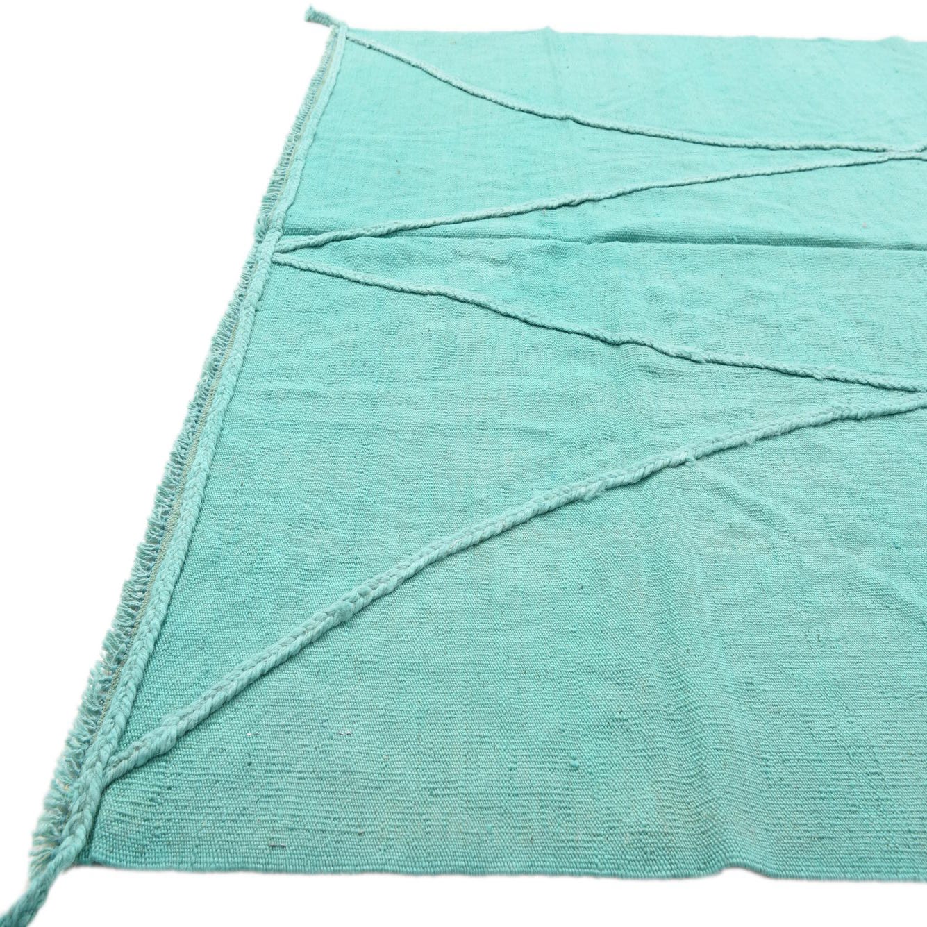 From the Kilim Modern collection, this hand-woven rug features a vivid turquoise background, providing a refreshing and lively foundation for any room. The crisp, clean color is offset by a simplistic, geometric diamond pattern that runs throughout the center of the design, adding a contemporary twist to the traditional kilim aesthetic. The texture of 100% wool contributes both durability and tactile comfort underfoot.