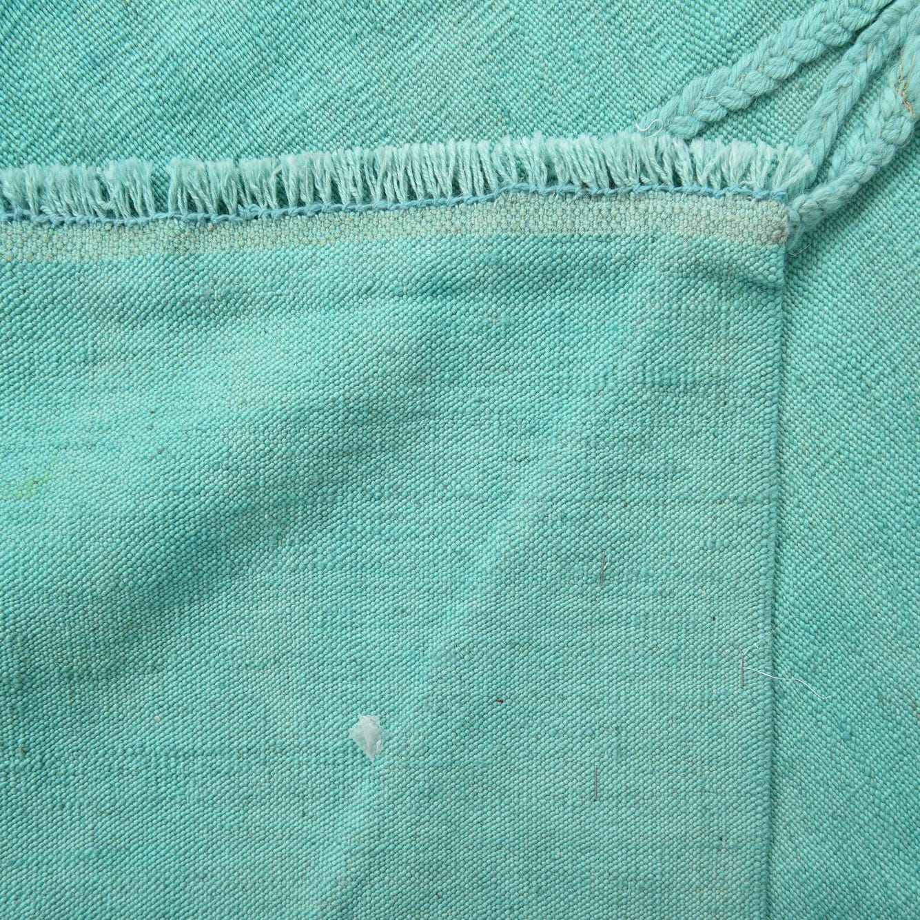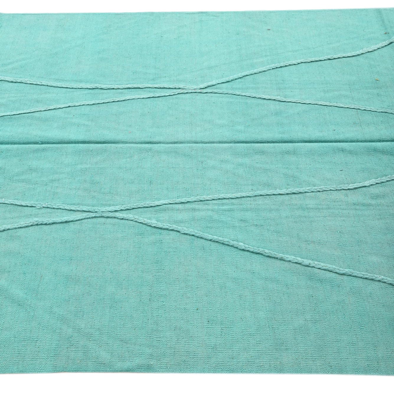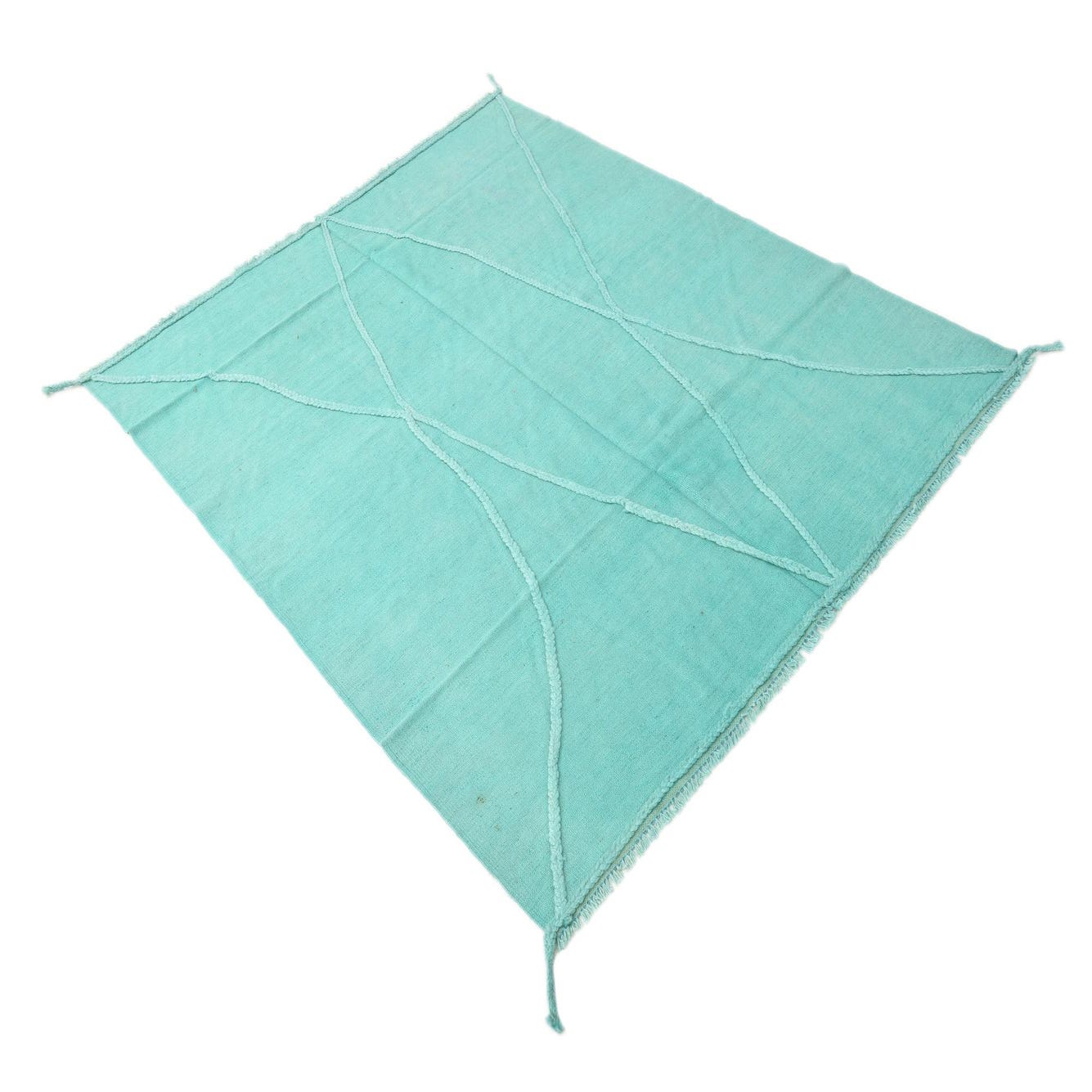 From the Kilim Modern collection, this hand-woven rug features a vivid turquoise background, providing a refreshing and lively foundation for any room. The crisp, clean color is offset by a simplistic, geometric diamond pattern that runs throughout the center of the design, adding a contemporary twist to the traditional kilim aesthetic. The texture of 100% wool contributes both durability and tactile comfort underfoot.