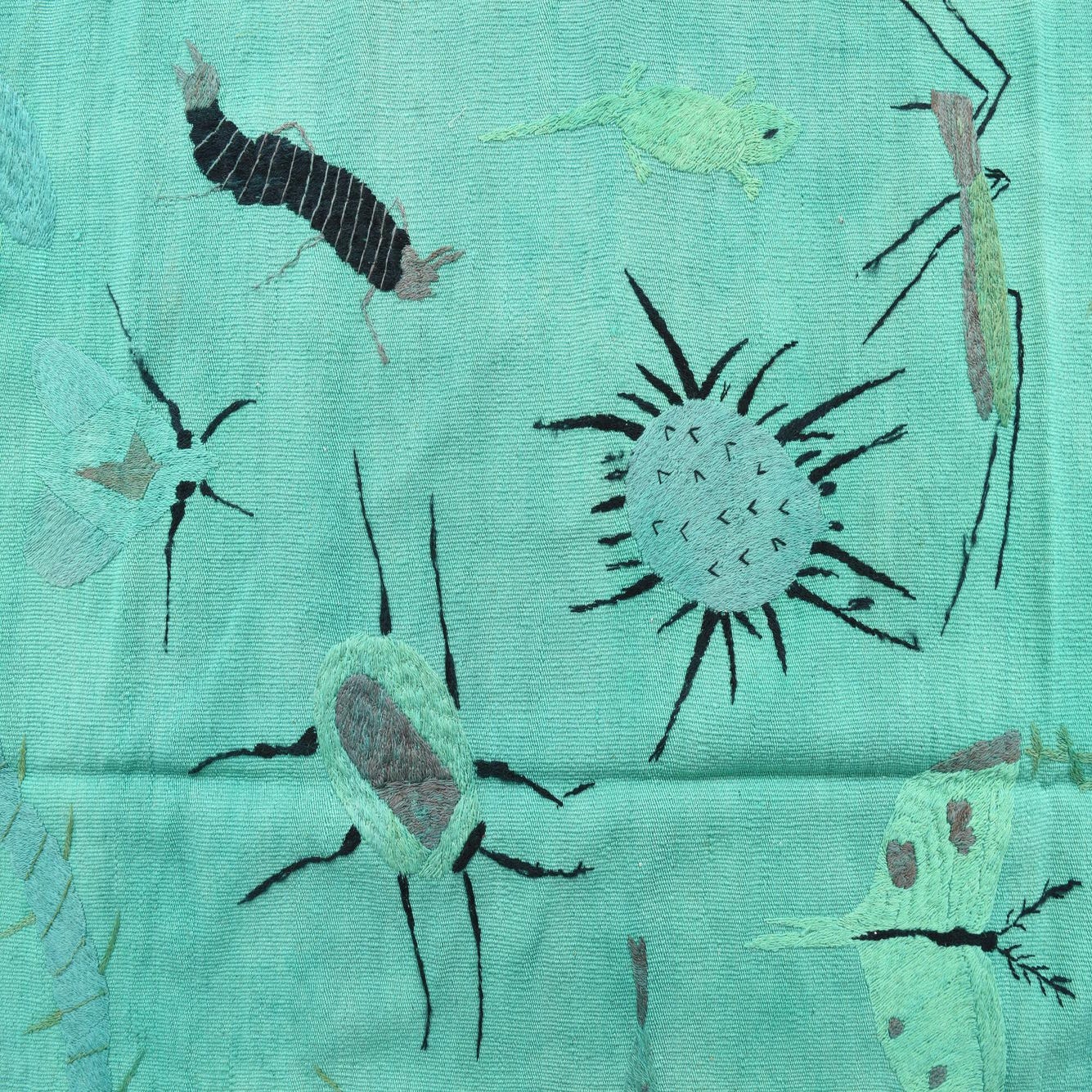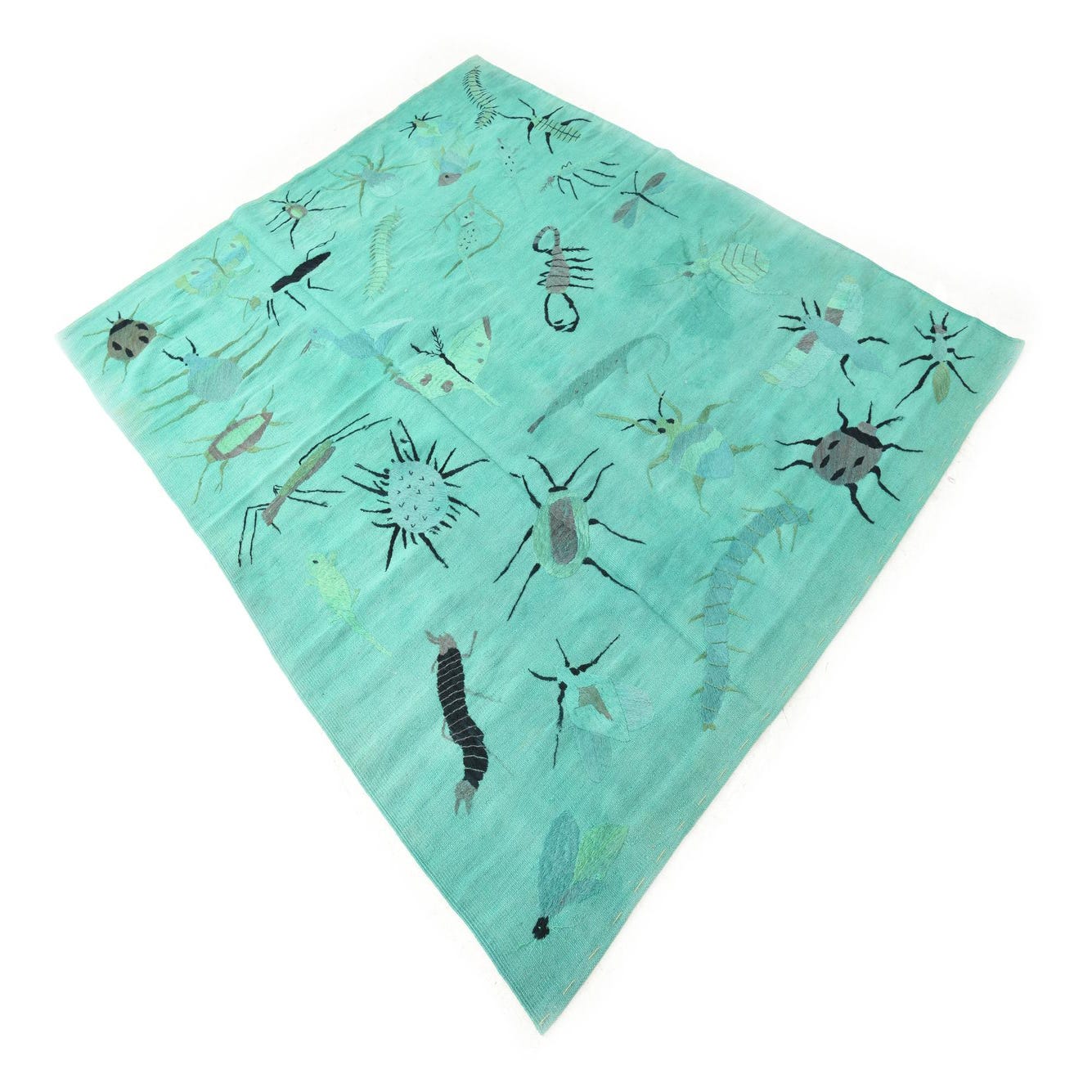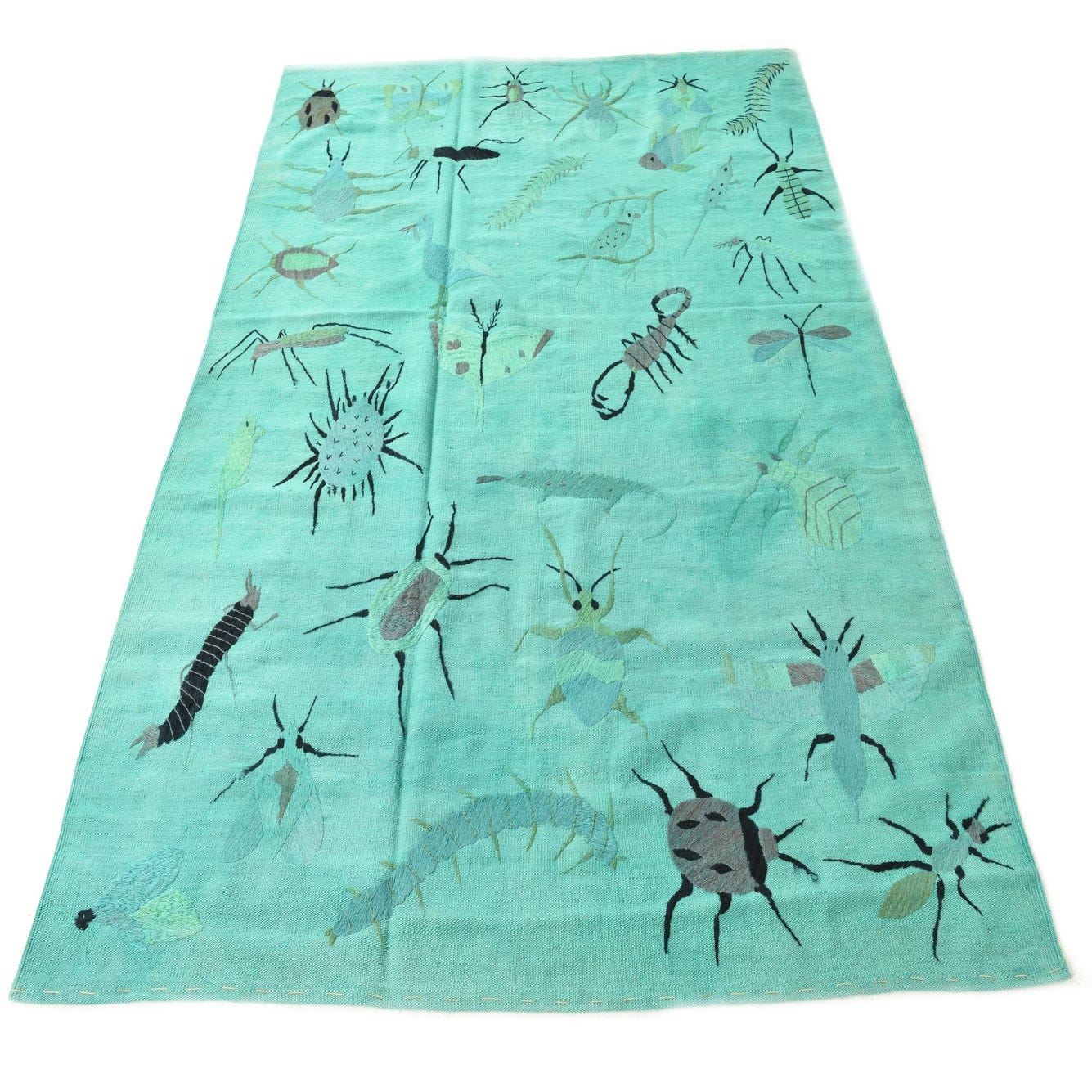 A 5x8 rectangular blue wool rug with various colorful insect and bug motifs in a modern tribal style.