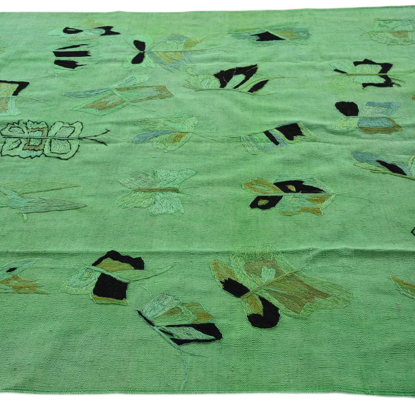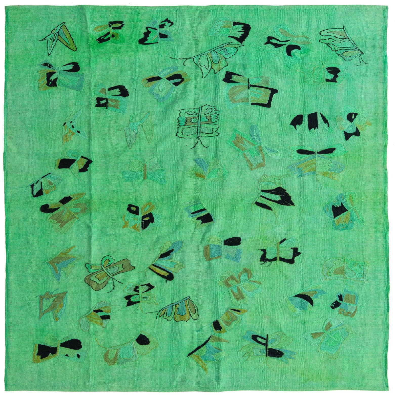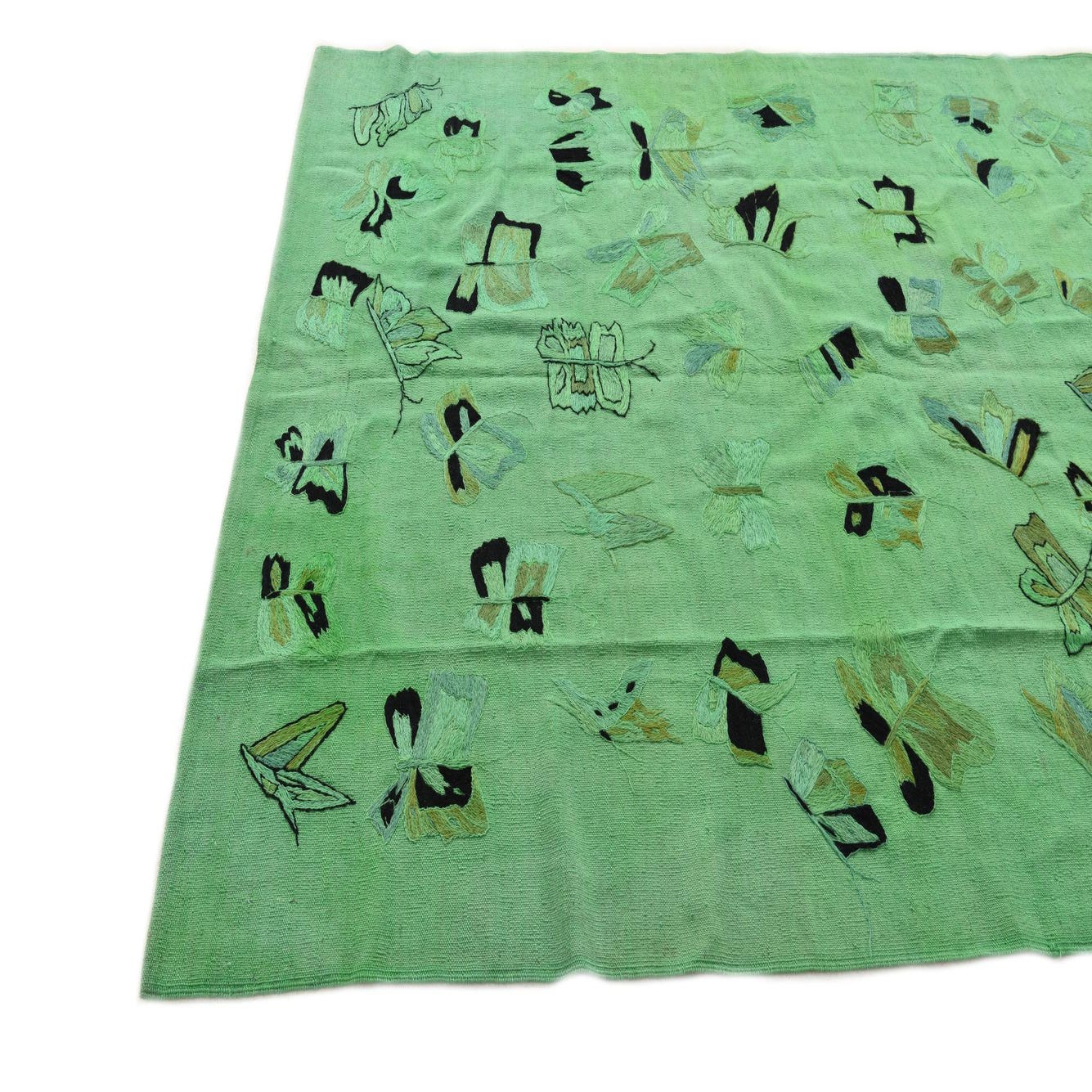 A 5x8 rectangular Kilim Suzani rug featuring a vibrant green background with abstract blue, black, and brown tribal patterns.