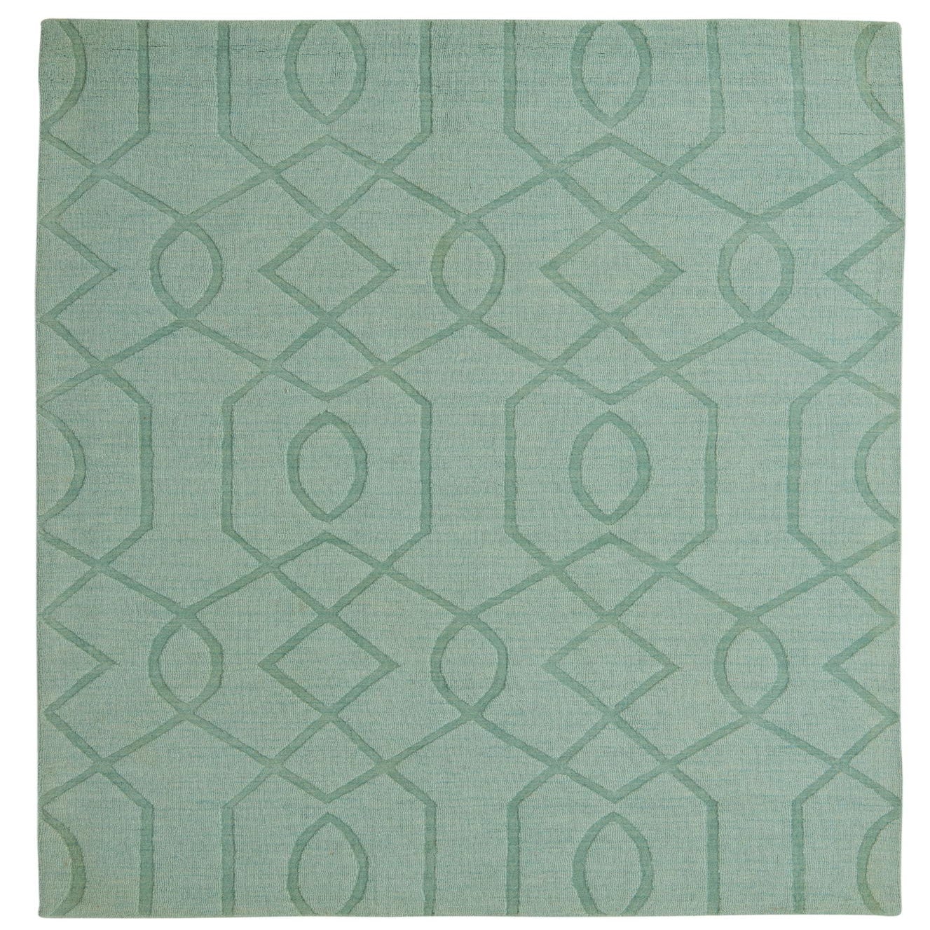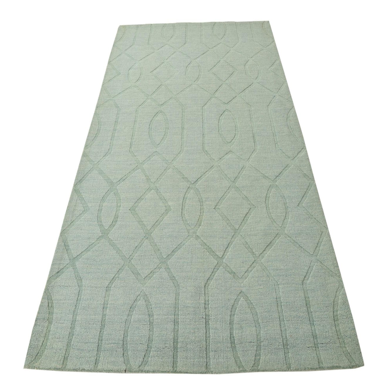 This Luna collection rug is a 5x8 hand-tufted piece, showcasing a contemporary blend of wool and cotton materials for a balanced combination of durability and comfort underfoot. The rug features a symmetrical geometric pattern with clean lines and a lattice-like design that provides a sense of structure to any room. The background color is a soothing turquoise, overlaid with a slightly darker tone to emphasize the pattern and create a harmonious contrast.