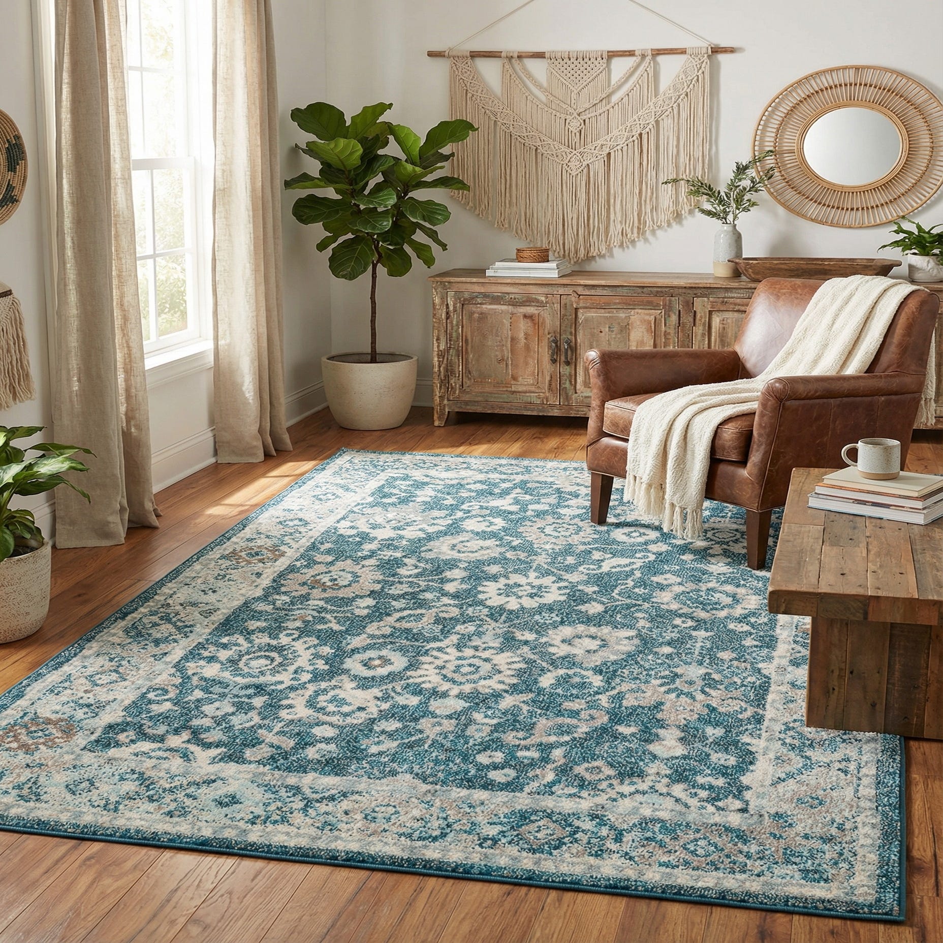 This rug pairs well with natural woods, woven textures, and neutral upholstery to let the turquoise pop without overpowering the room. It works in living rooms beneath a coffee table, layered in bedrooms for color and softness underfoot, or placed in dining and entry areas where a durable, patterned anchor is desired. The palette and pattern suit transitional, coastal, cottage, and modern farmhouse interiors, and it also complements contemporary spaces that benefit from a touch of traditional detail.