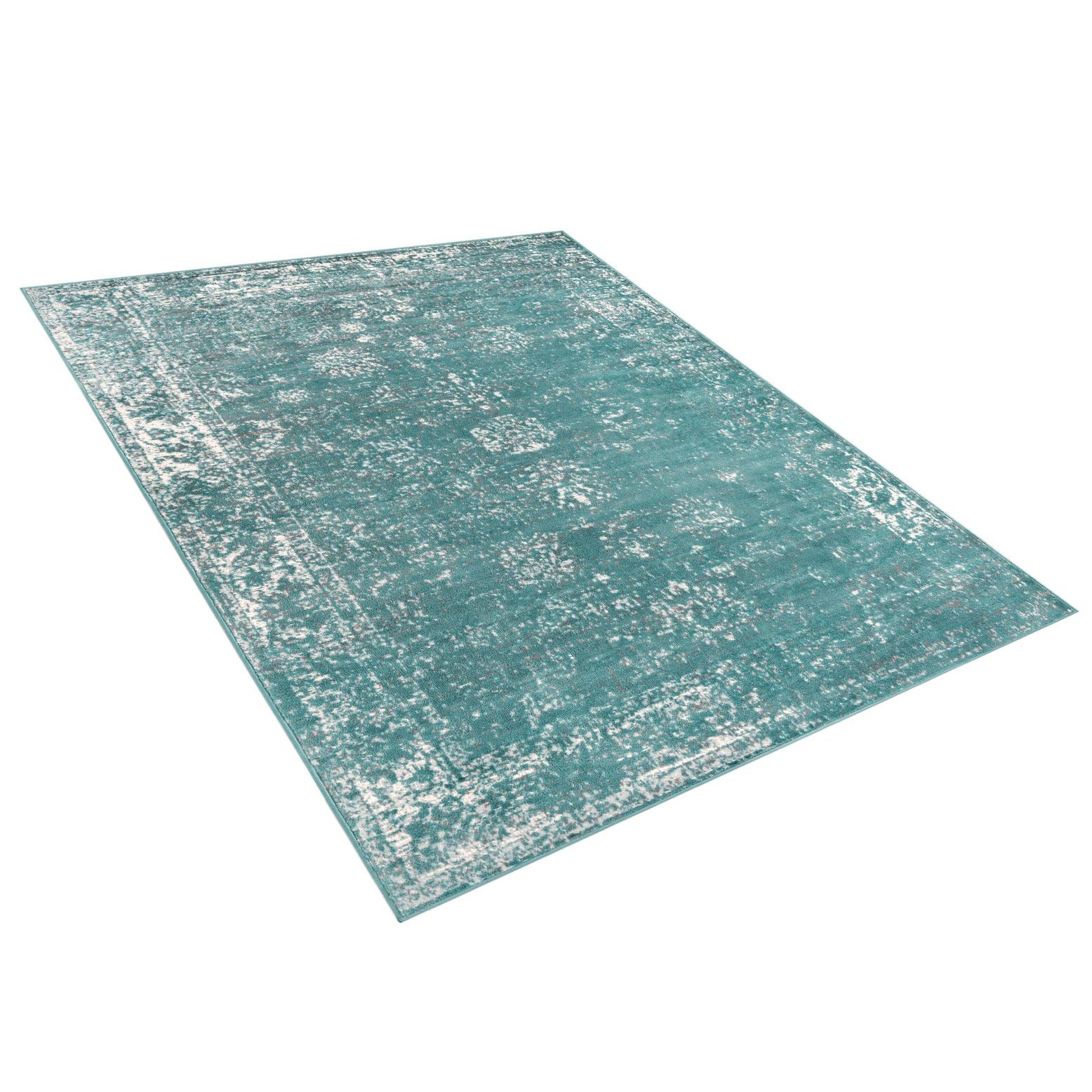 A modern take on a timeworn rug, this machine-made piece in 100% polypropylene layers a distressed, Persian-inspired motif over a turquoise ground. Ivory accents form softened medallions and floral hints that break through the background, while gray tones add depth and a gently aged appearance. The low-pile surface feels smooth to the touch with a subtle sheen, offering a comfortable underfoot texture and a refined, lived-in look.