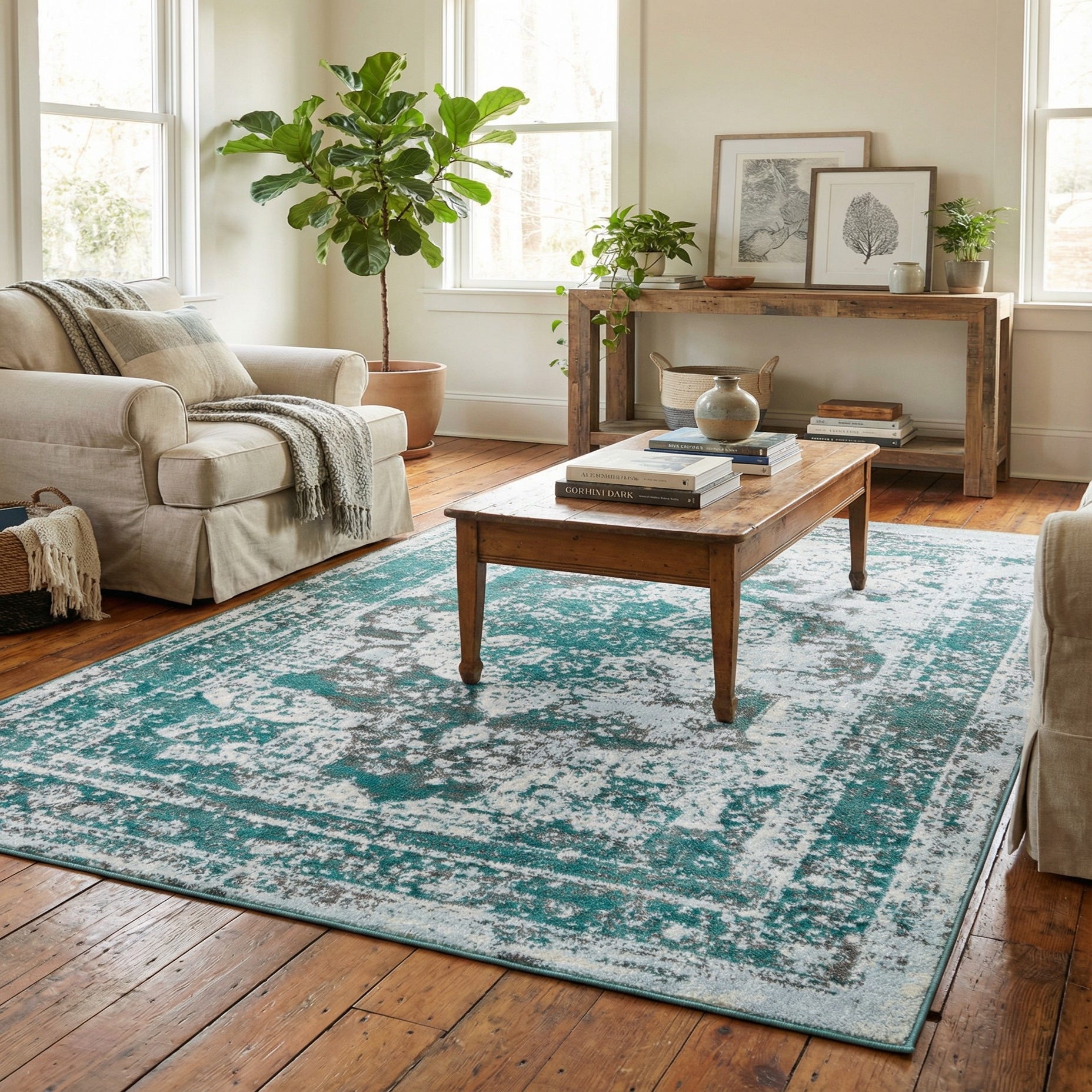 Primary color is Turquoise. Colors in this rug include: Turquoise, Blue, Gray, Ivory.