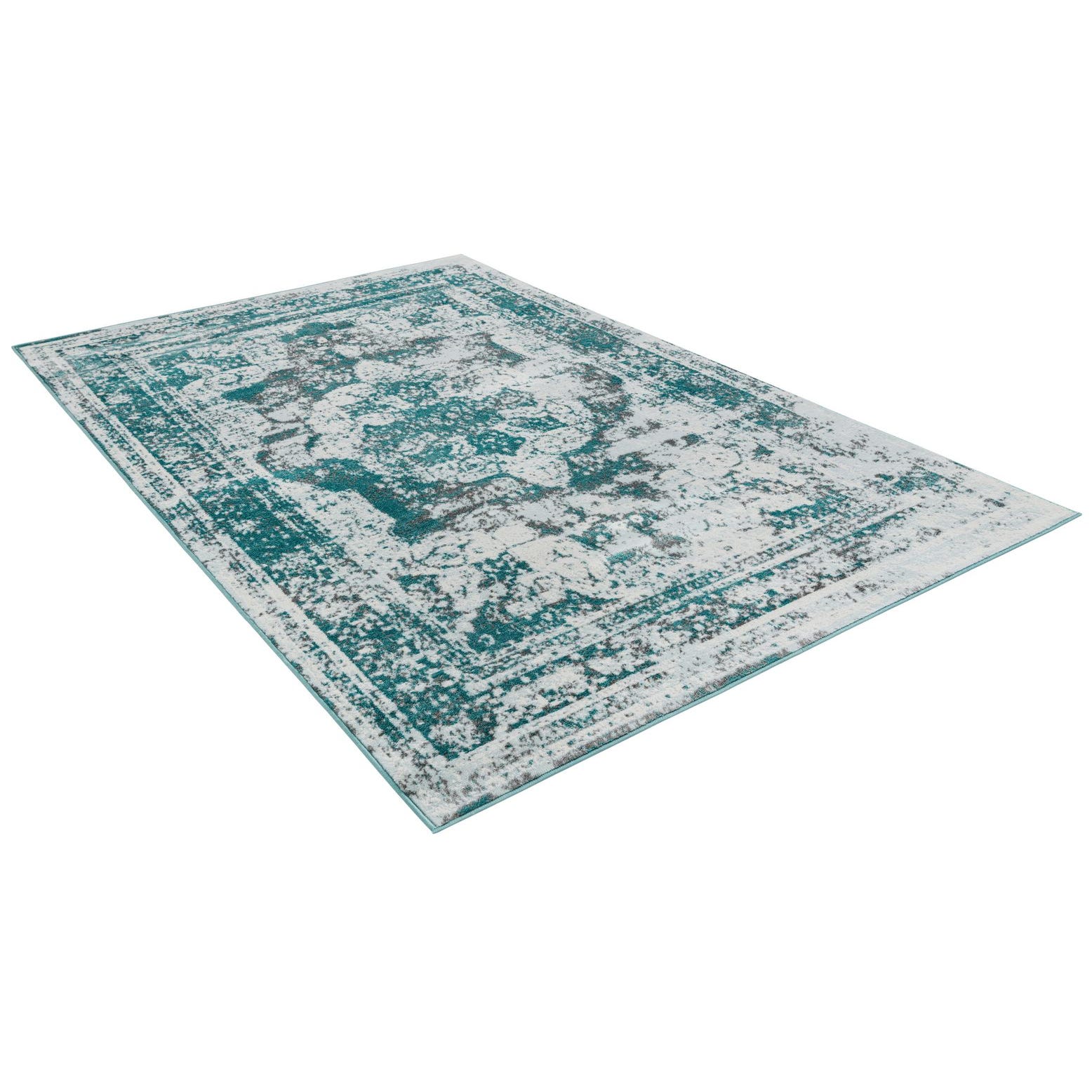 Primary color is Turquoise. Colors in this rug include: Turquoise, Blue, Gray, Ivory.