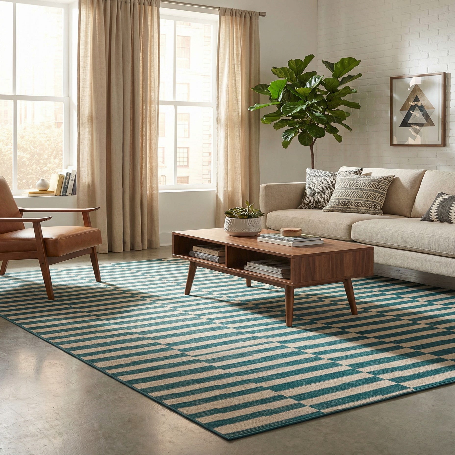 The rug’s modern, graphic aesthetic pairs nicely with light wood finishes, white or neutral upholstery, and matte metal accents for a fresh, contemporary look. Use it to define a seating area, brighten an entryway, or add color and structure to a dining space — the linear pattern works especially well beneath a coffee table or along a hallway. The turquoise-and-ivory palette brings a clear pop of color that’s easy to layer with woven textures, simple artwork, and clean-lined furniture.