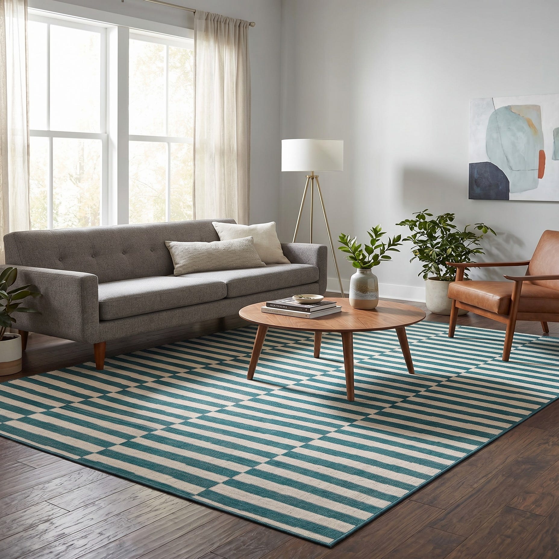We bought 2 of these - one fr our living room and one for the kitchen - since the rooms are open and have the same color scheme. Pay attention to the pile height - it is pretty flat and not as plush as the other low pile rugs we ordered. And because of that it is taking a while to lay completely flat. The larger size flattened out quicker than the smaller size and we can still see some ripples and the corners still stick up. Color is gorgeous though (we got the teal) and size is accurate.