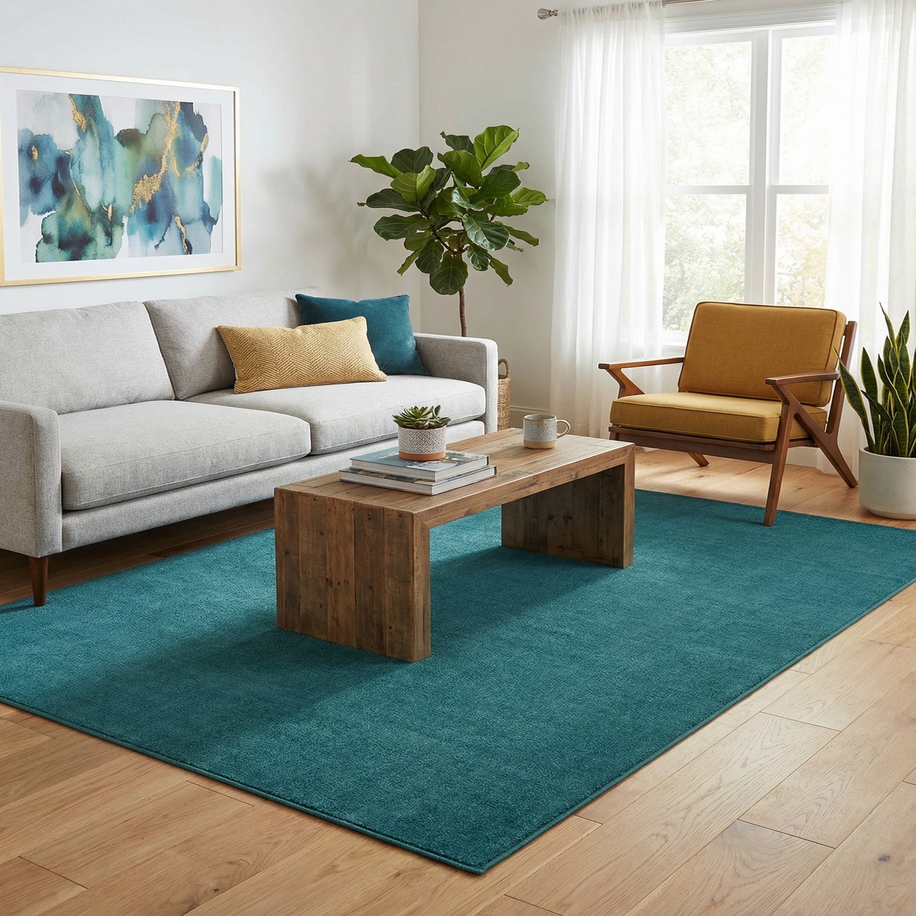 A clean, modern field of turquoise fills this rug, with deeper teal threads woven throughout to create a soft, heathered effect rather than a strict solid. The overall pattern is minimalist and tonal—subtle striations and slight variation in pile catch the light and add visual depth while keeping a calm, contemporary look. This colorway works well with coastal palettes, mid-century wood tones, or a crisp, modern scheme where a single, confident color anchors the room.