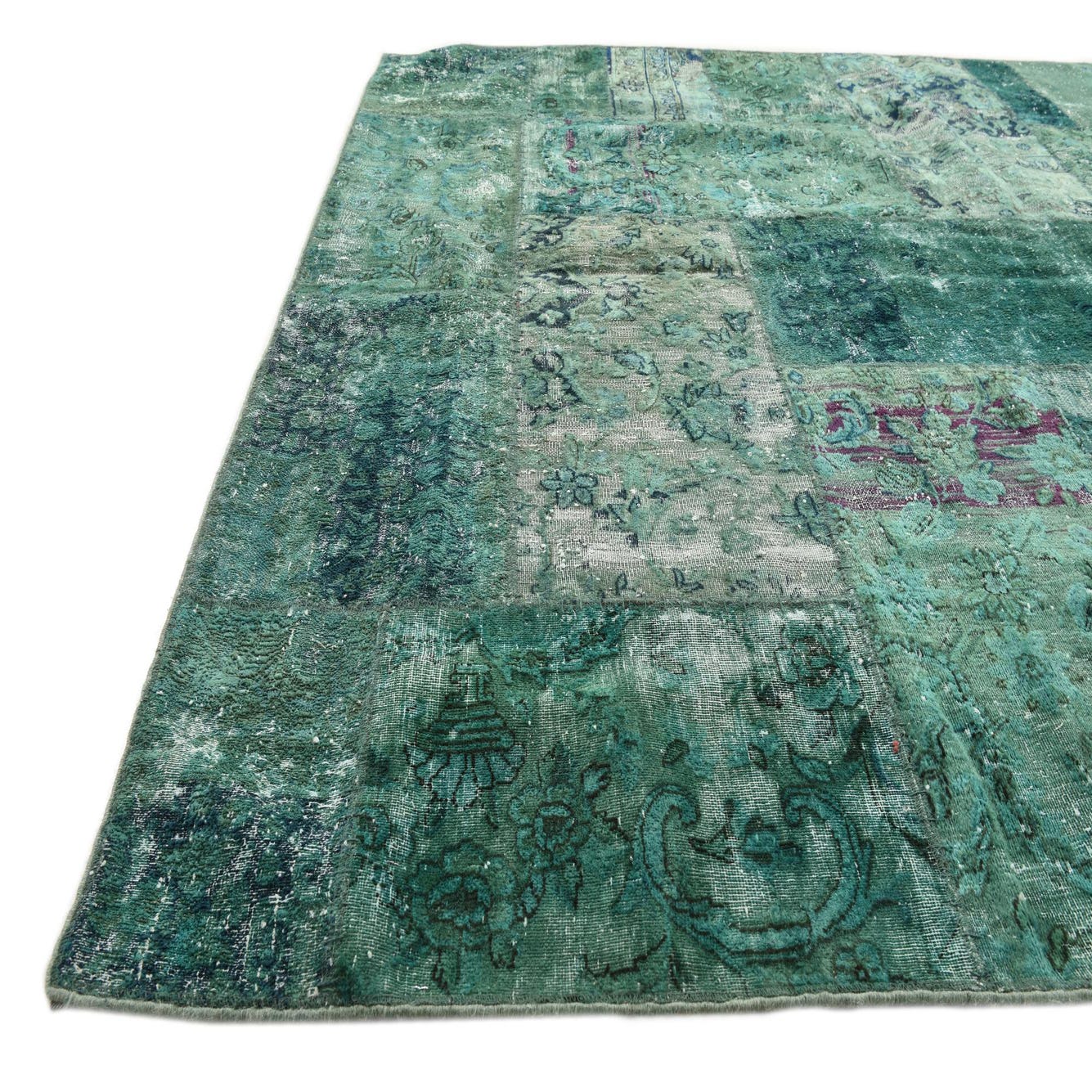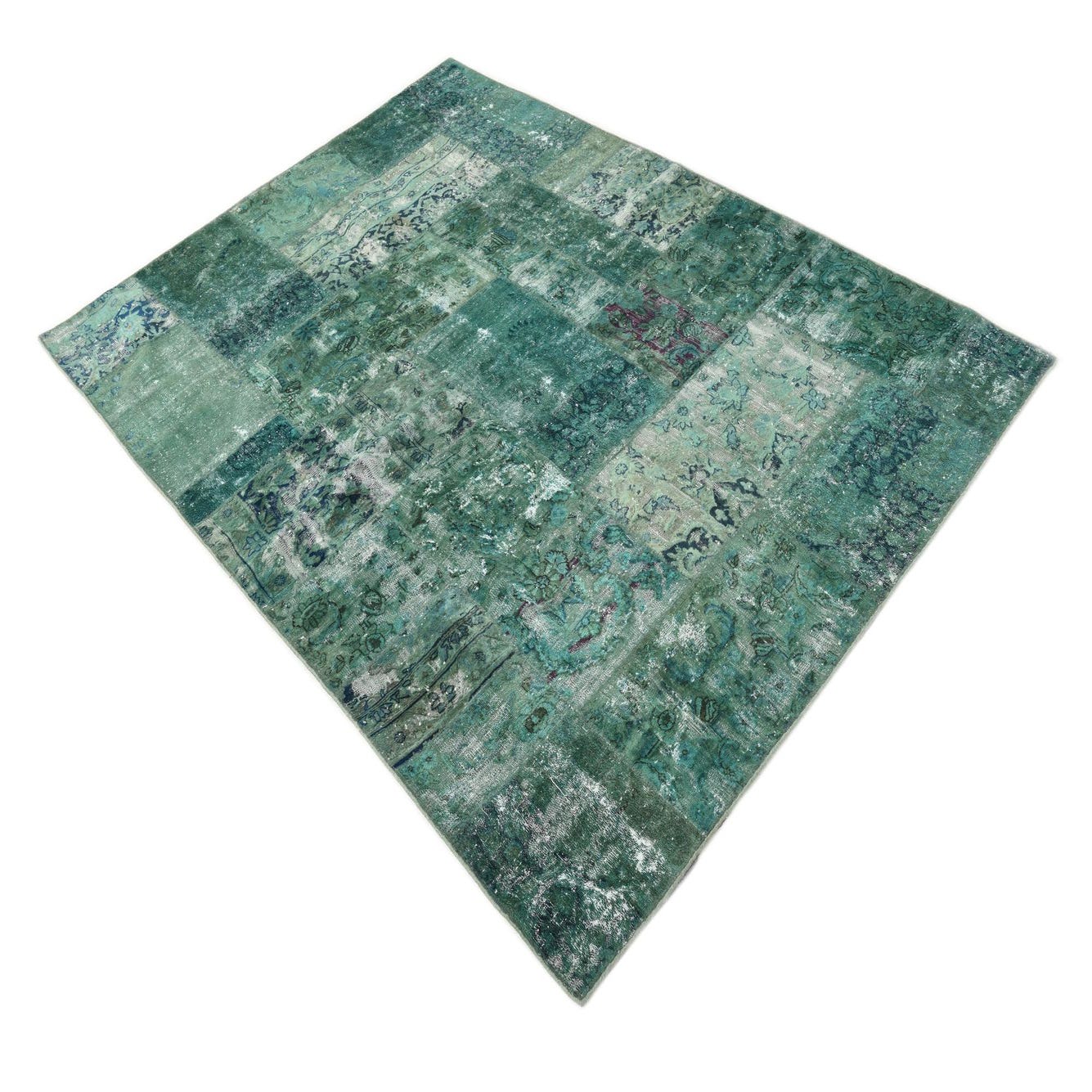The Ultra Vintage collection offers a 5x8 hand-knotted rug that presents a masterful amalgamation of colors with a turquoise background, complemented by light brown, light green, burgundy, and olive accents. The design is a testament to traditional patterns, featuring a patchwork of motifs that suggest a rich narrative of historic craftsmanship.