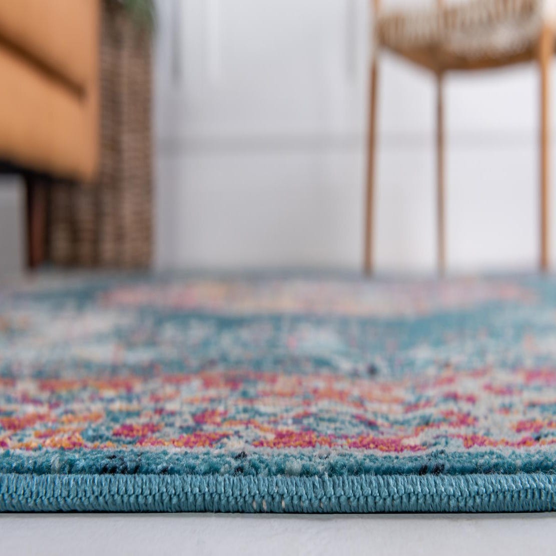 A vibrant turquoise ground sets the stage for a vintage-inspired medallion runner with a gently distressed finish. Two softened central medallions in shades of pink and ivory are accented by pops of gold, orange and red, while layers of blue and navy add depth and contrast. The patterned border carries the same palette in a more fragmented, painterly way, creating a lively yet balanced look. Machine made from 100% polypropylene, the rug has a low, dense pile that feels smooth underfoot and holds its color with a subtle sheen.