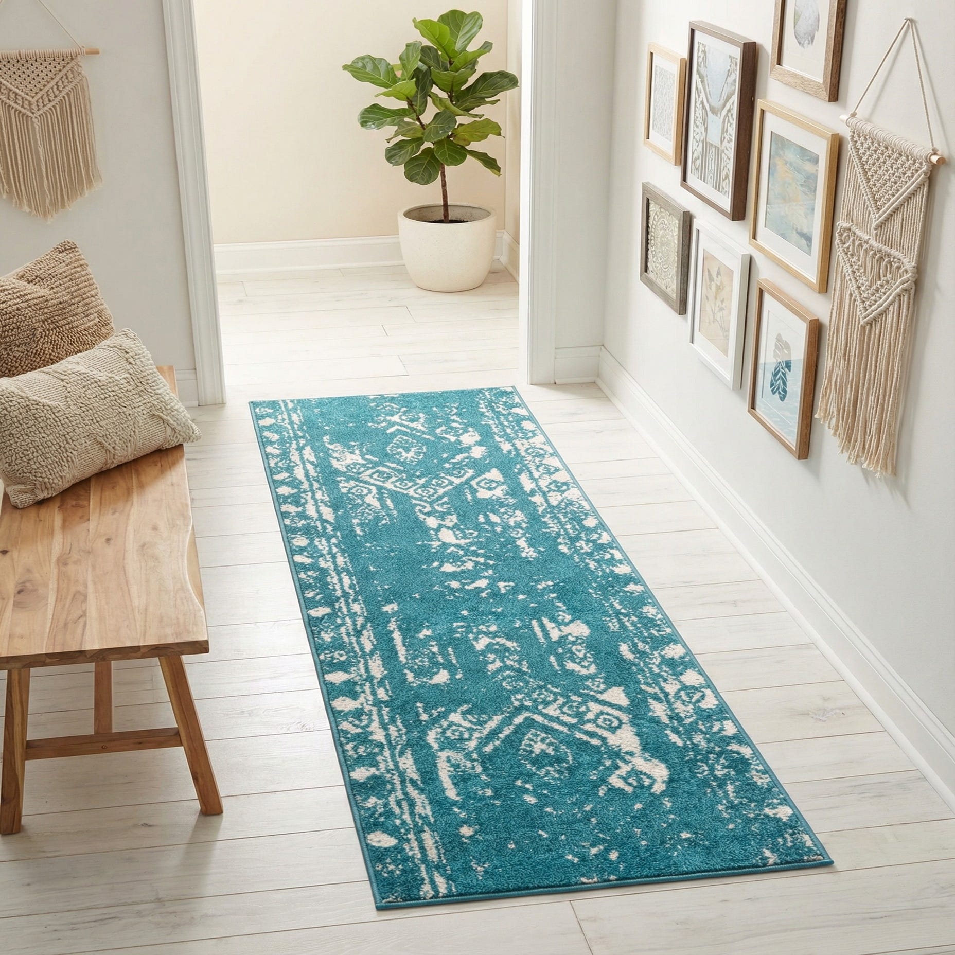 A vibrant turquoise field provides the backdrop for an ivory, distressed medallion and border motif that blends traditional ornament with a weathered, painterly finish. The pattern reads like a timeworn antique updated for modern tastes, with irregular edges and soft, broken lines that give the rug visual movement without overwhelming a room. Machine made from 100% polypropylene, the dense, low-to-medium pile feels soft and slightly cushioned underfoot while maintaining a structured surface that showcases the contrast between color and pattern.